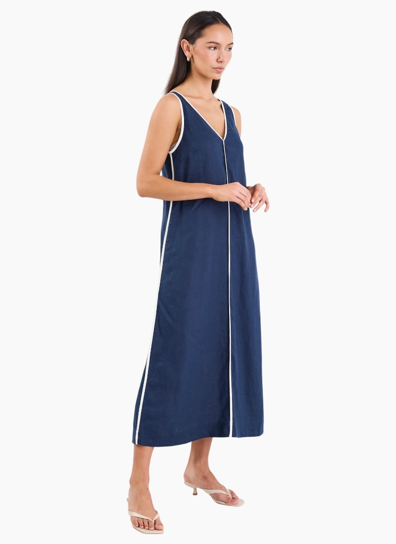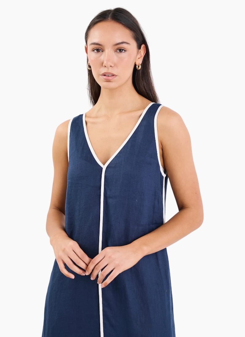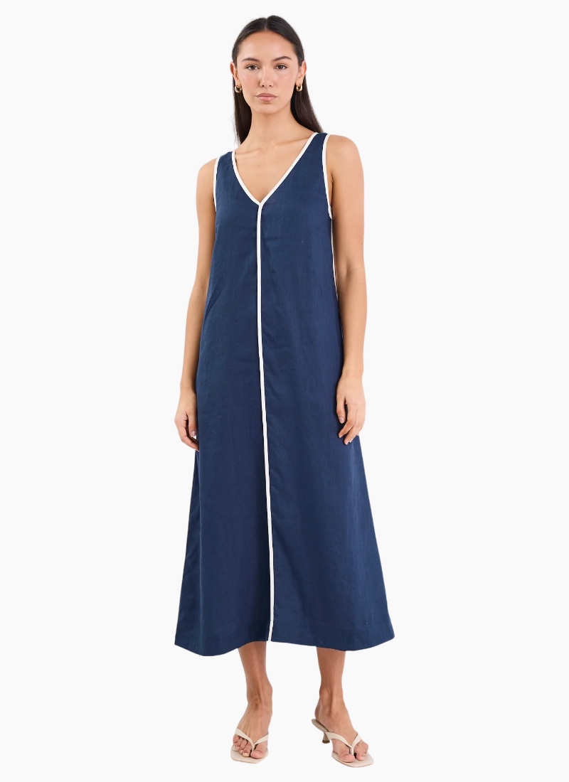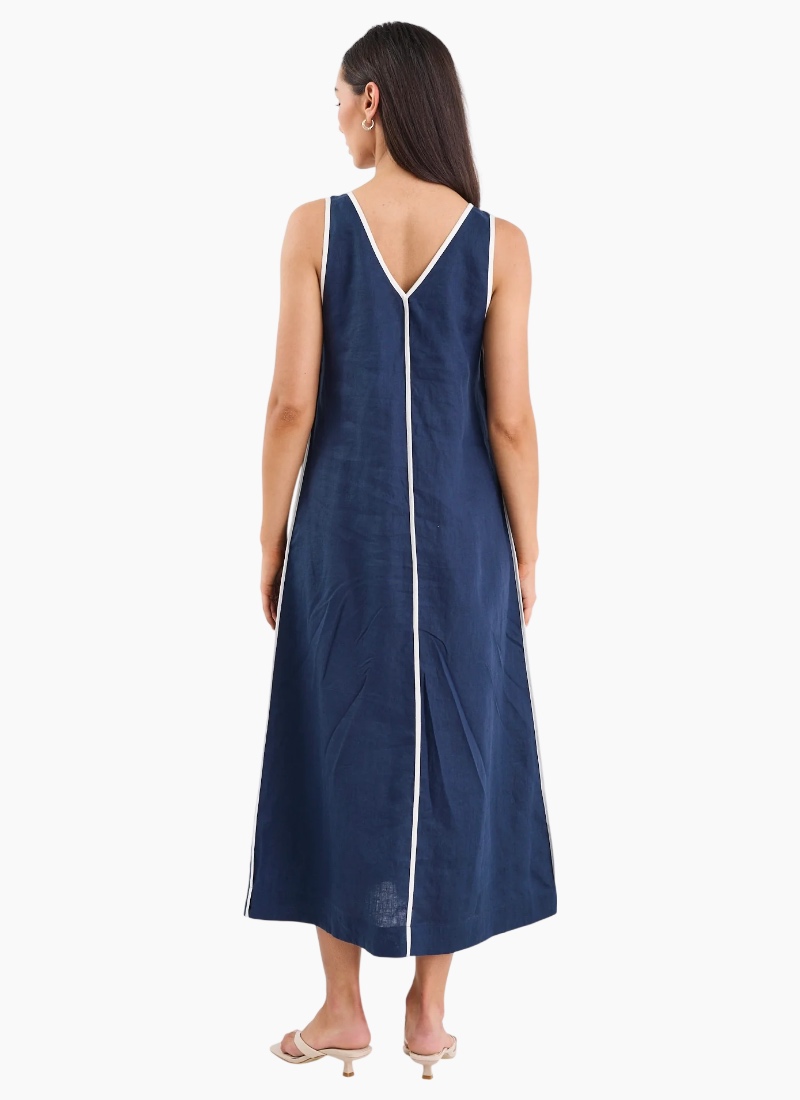 Introducing the Siesta Navy Linen Contrast Sleeveless Maxi Dress from Re:Union. This breezy navy maxi blends effortless summer style with thoughtful contrast detailing for a refined daytime look.