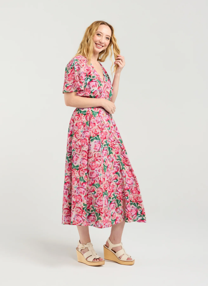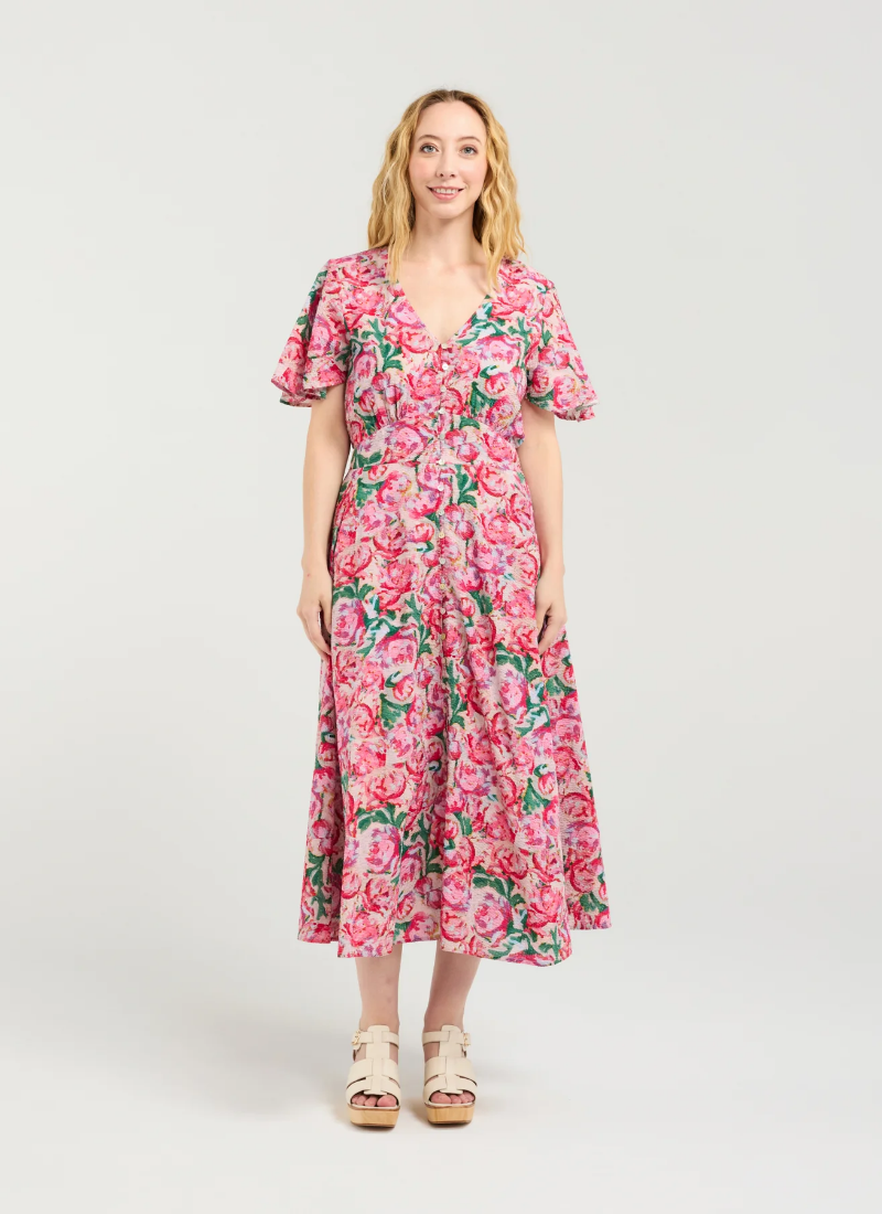 This button-down dress boasts a graceful V-neckline and airy butterfly-style short sleeves, adorned with a charming floral print. A small waist panel and elastication at the back ensure a comfortable and flattering fit, perfect for a stylish and relaxed ensemble.