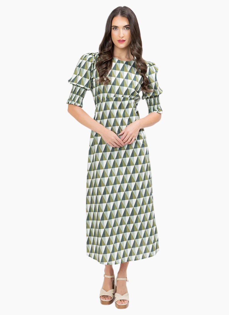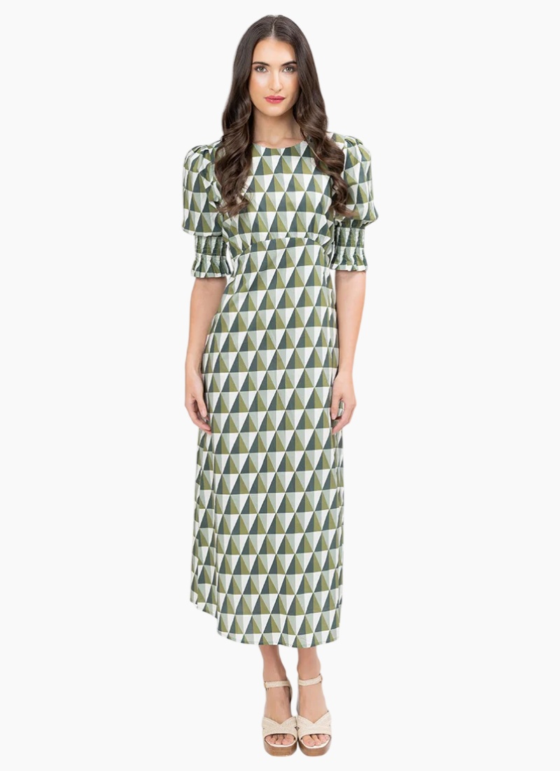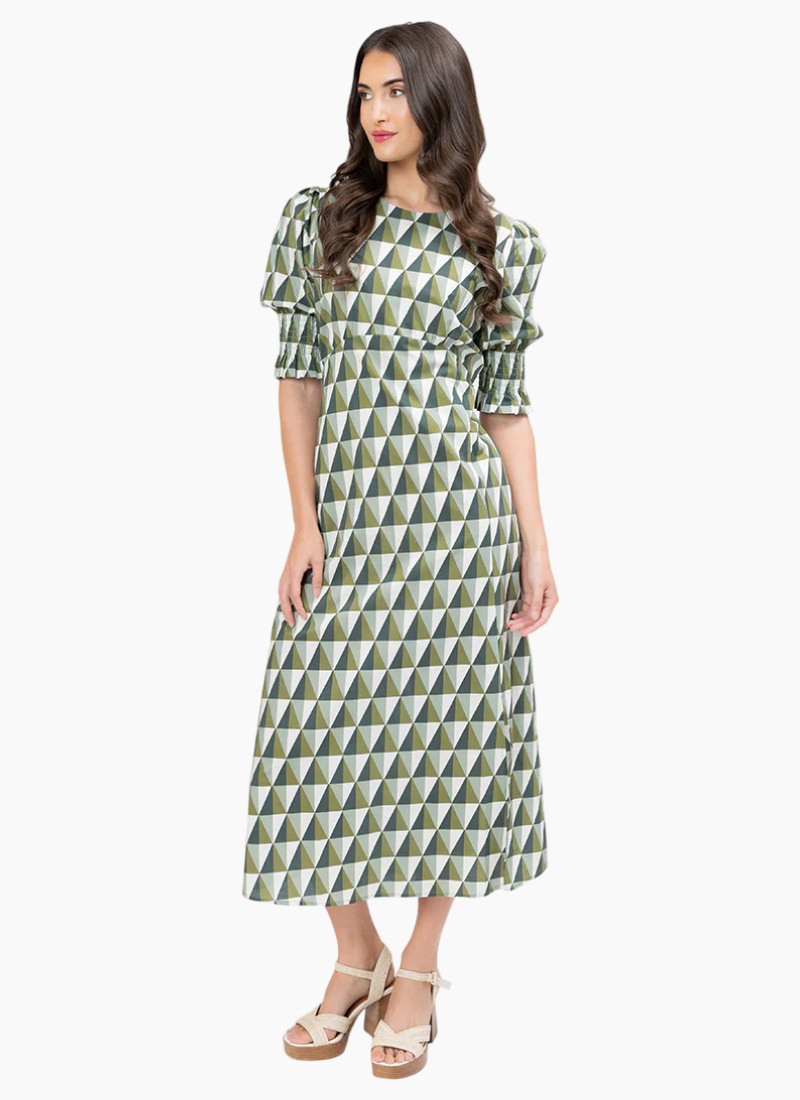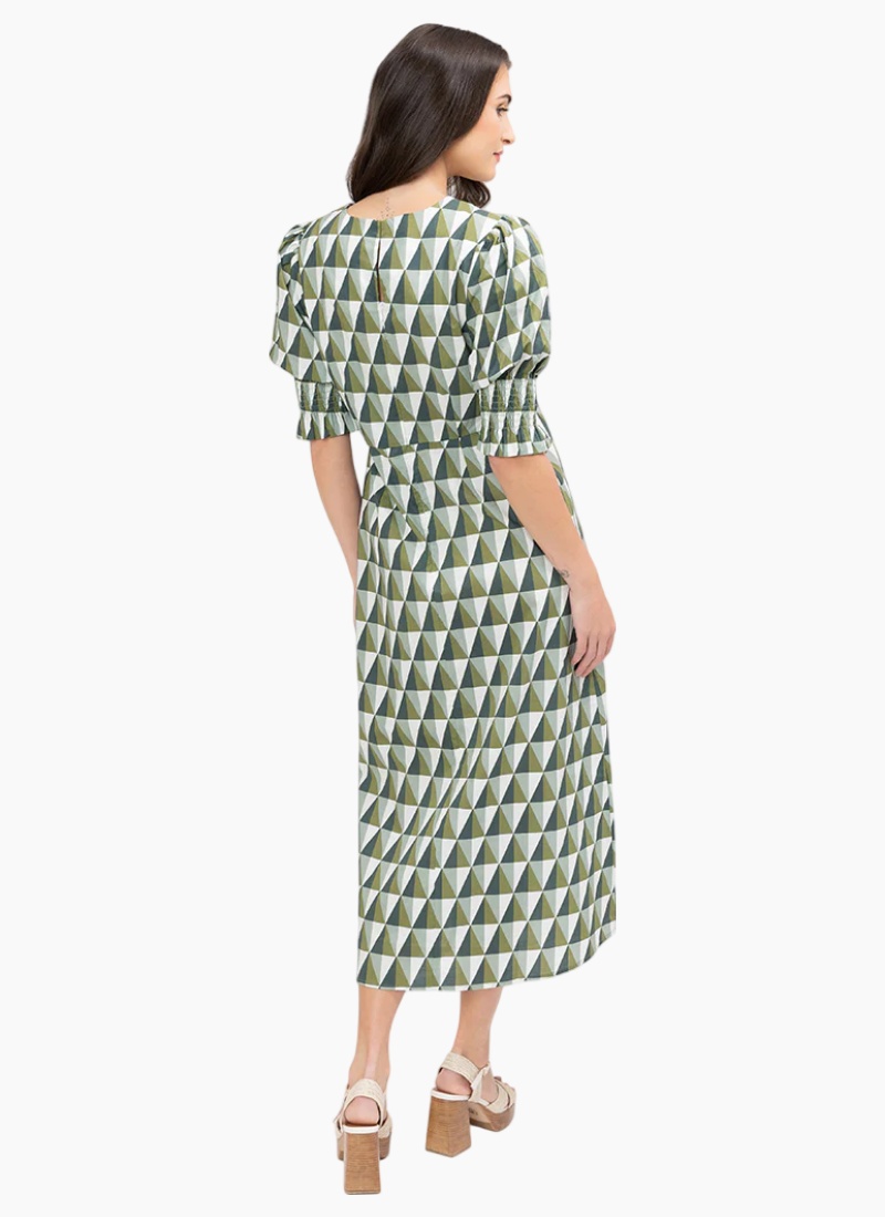 - Olive green geometric print offers striking visual interest and versatile colourway