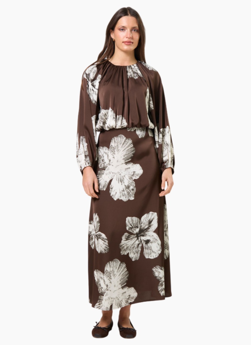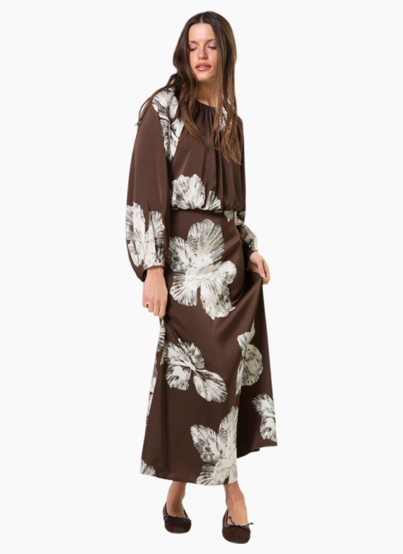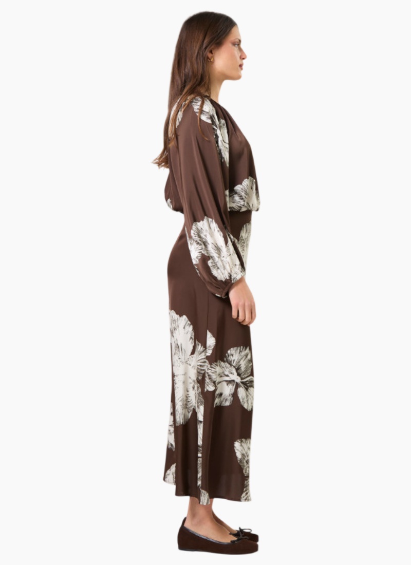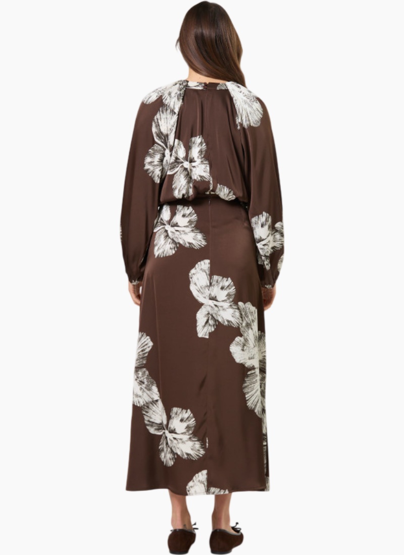 Maxi dress with gathered neckline and full gathered sleeve with raglan armhole. Invisible zip opening and back hook & eye and button fastening. Bias cut skirt.