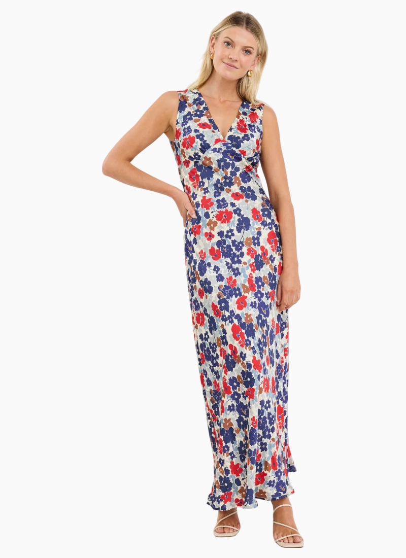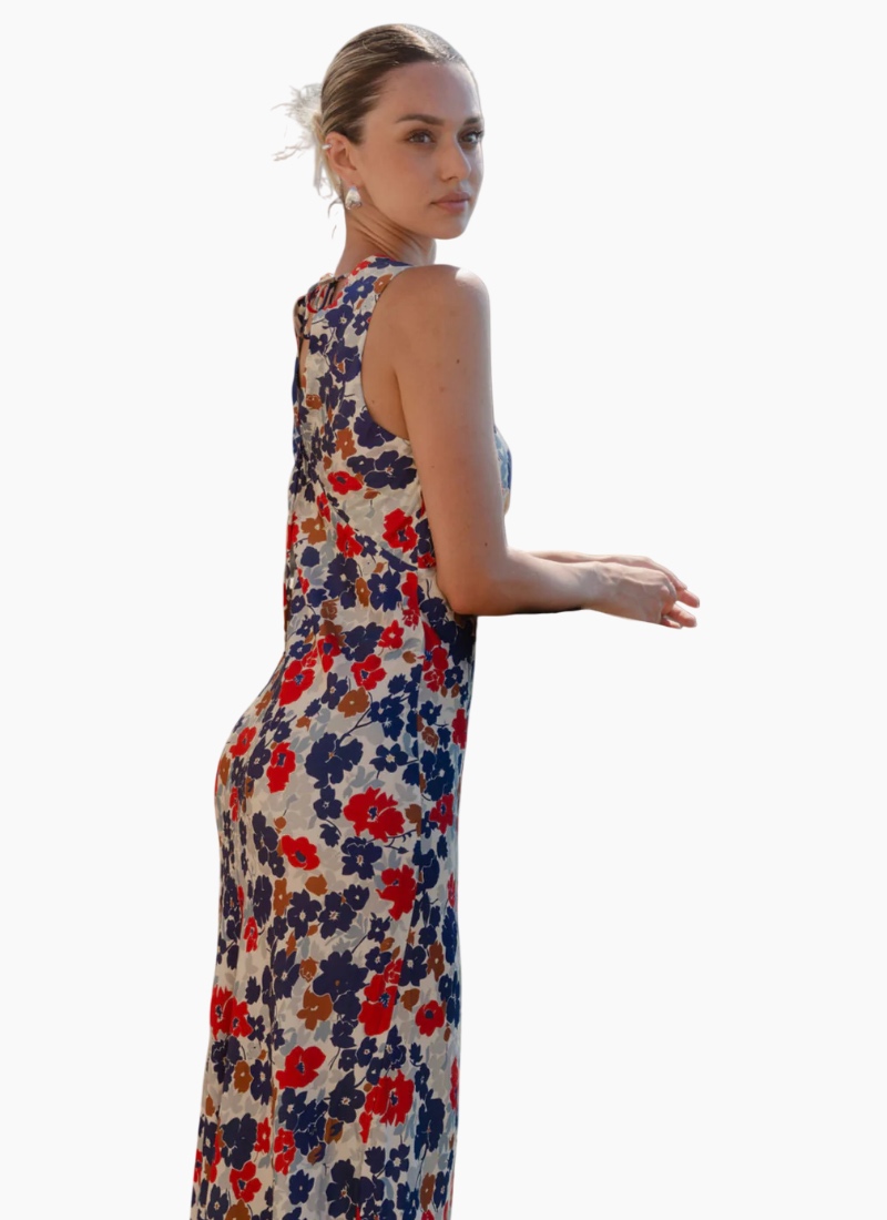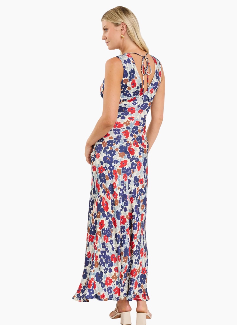 This dress brings effortless elegance to life with its beautifully draped bias cut and silky feel. The vibrant poppy print in striking red and deep blue tones adds a playful yet polished charm, perfect for days when you want to feel joyful, confident, and just a little flirty.