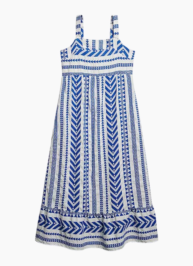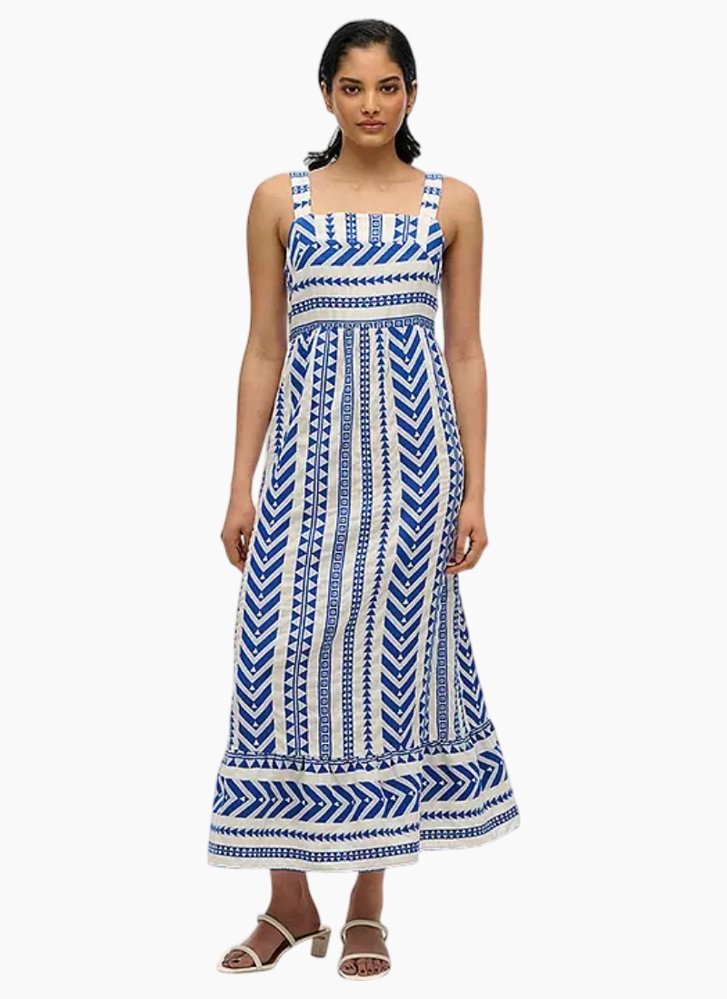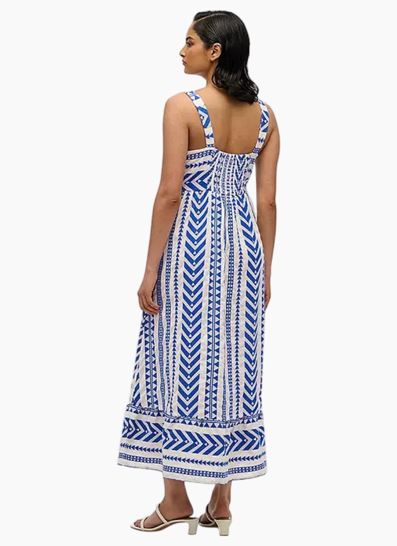 Introducing the Statement Tiered Maxi Dress from Superdry. A breezy, printed maxi that channels holiday-ready ease with bold blue and white geometric motifs.