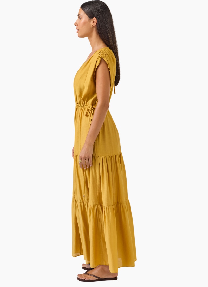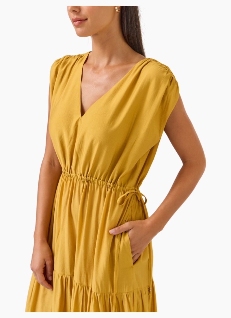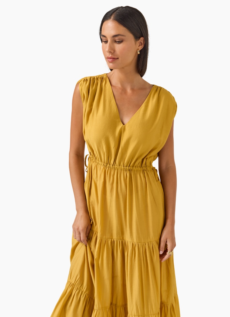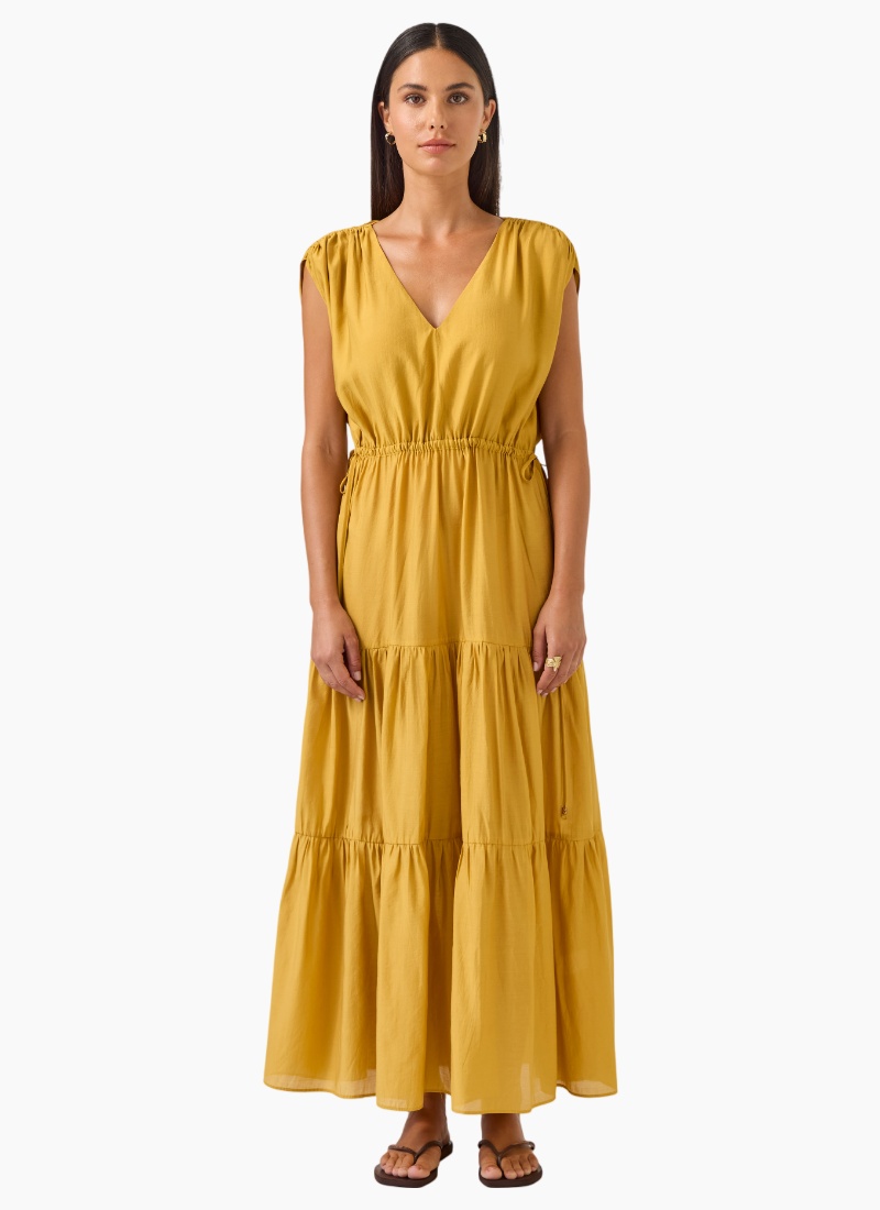 A brand new style already on every TUESDAY girl’s wishlist. With her rouched shoulders and deep v neckline she’s immediately striking, while her drawstring waist ensures an adjustable fit. In a stunning lightweight fabrication she’s the perfect piece for an effortless event season.Relaxed fit – size down if you prefer less fabric. See our size chart below to double check garment measurements. Model is 5’8” and wears size 8. FEATURES & FIT • deep v neck front & back • adjustable tie across shoulder blades • cap sleeves with ruched shoulder detailing • drawstring waist for customised cinching • side seam pockets • floaty 3-tiered skirt • ankle length • intentionally designed for a relaxed fit – size down if you prefer less fabric FABRIC & CARE • 90%rayon 10%poly crepe • double layer bodice, unlined skirt (wear with nude knickers or add a slip skirt) • mustard gold colour • hand wash or cool delicate machine wash with care • refer to care label for further details