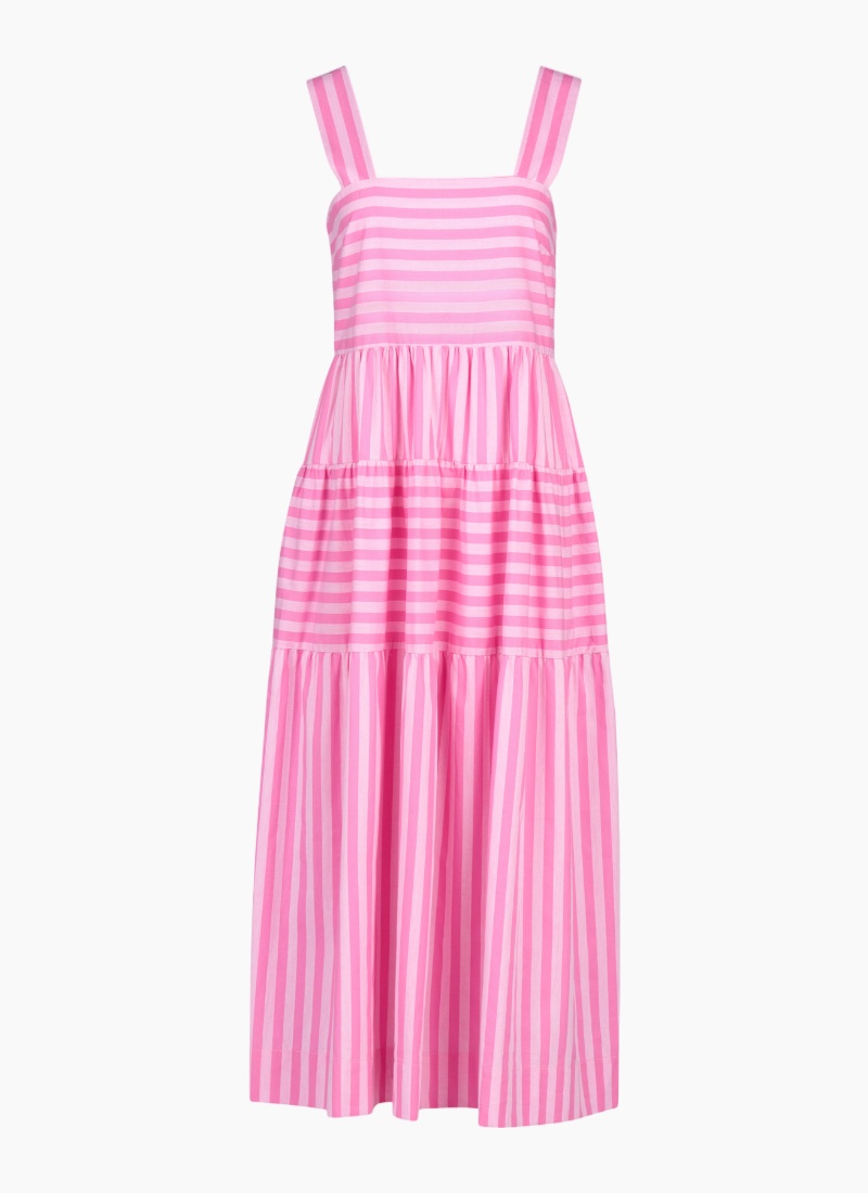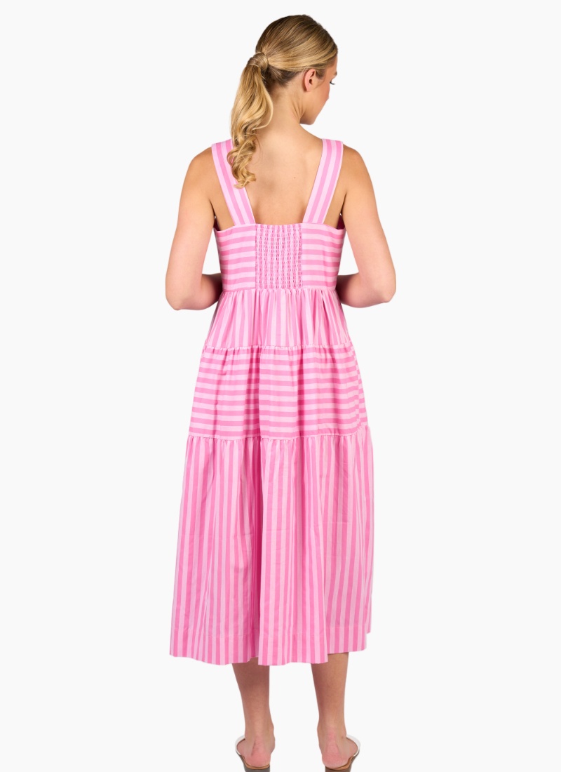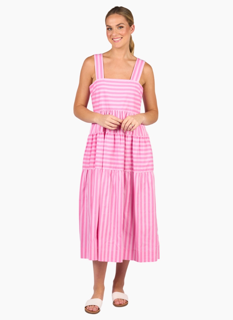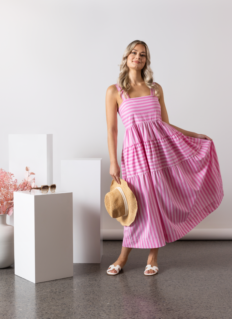 This sleeveless tiered dress is made from soft, lightweight 100% cotton in a fresh pink stripe pattern. Designed with wide straps and a shirred back panel, it offers a comfortable fit and an easy, elegant look for sunny days.• Square neckline • Empire waistline with gathered tiered layers • Side seam pockets • Back shirred panel • Alternating horizontal and vertical striped panels • Relaxed fit • Model is 180cm tall, and wears a size 10