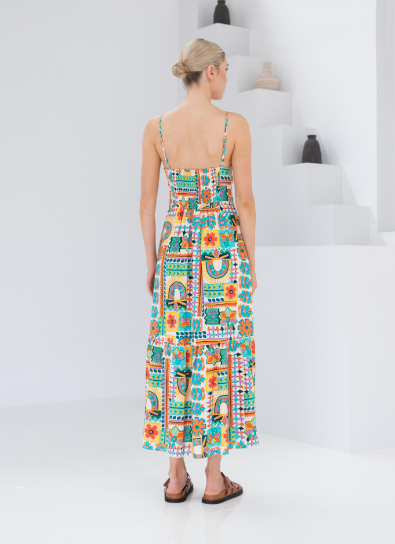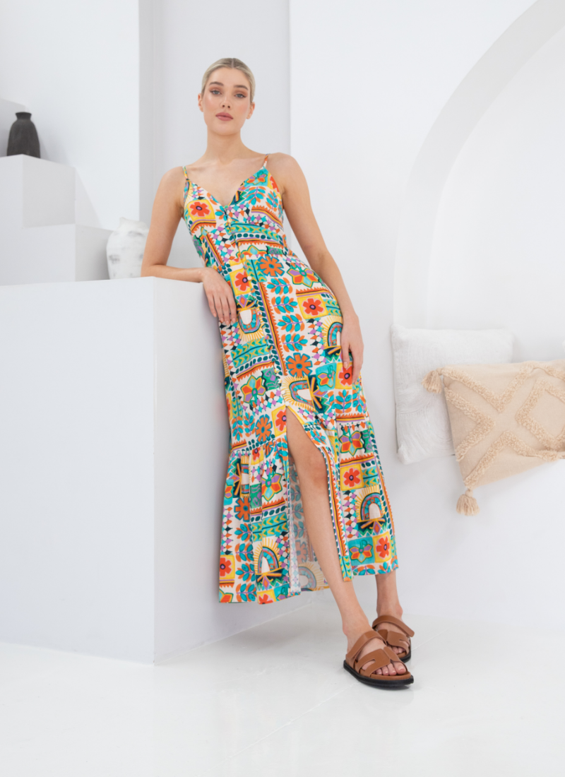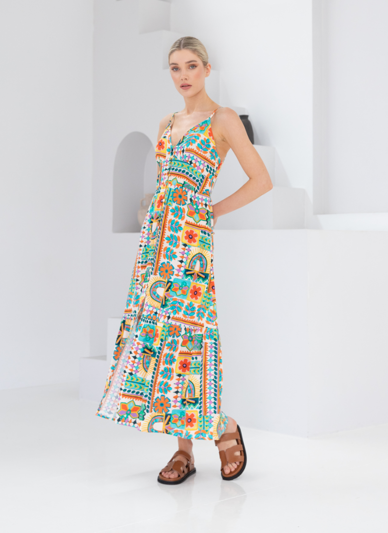 Introducing the Elora Maxi Dress from White Closet. This vibrant maxi celebrates sunny days with a breezy silhouette and lively print.