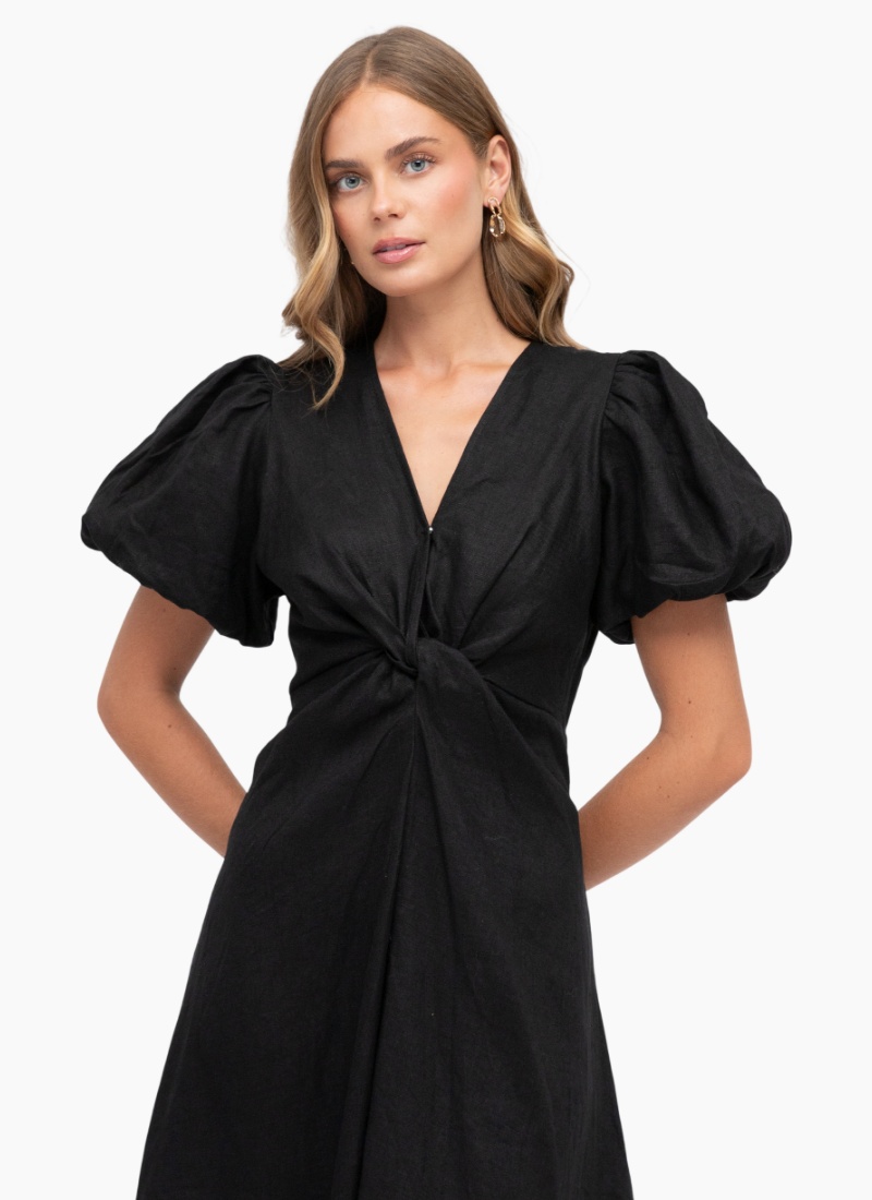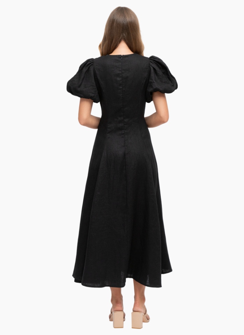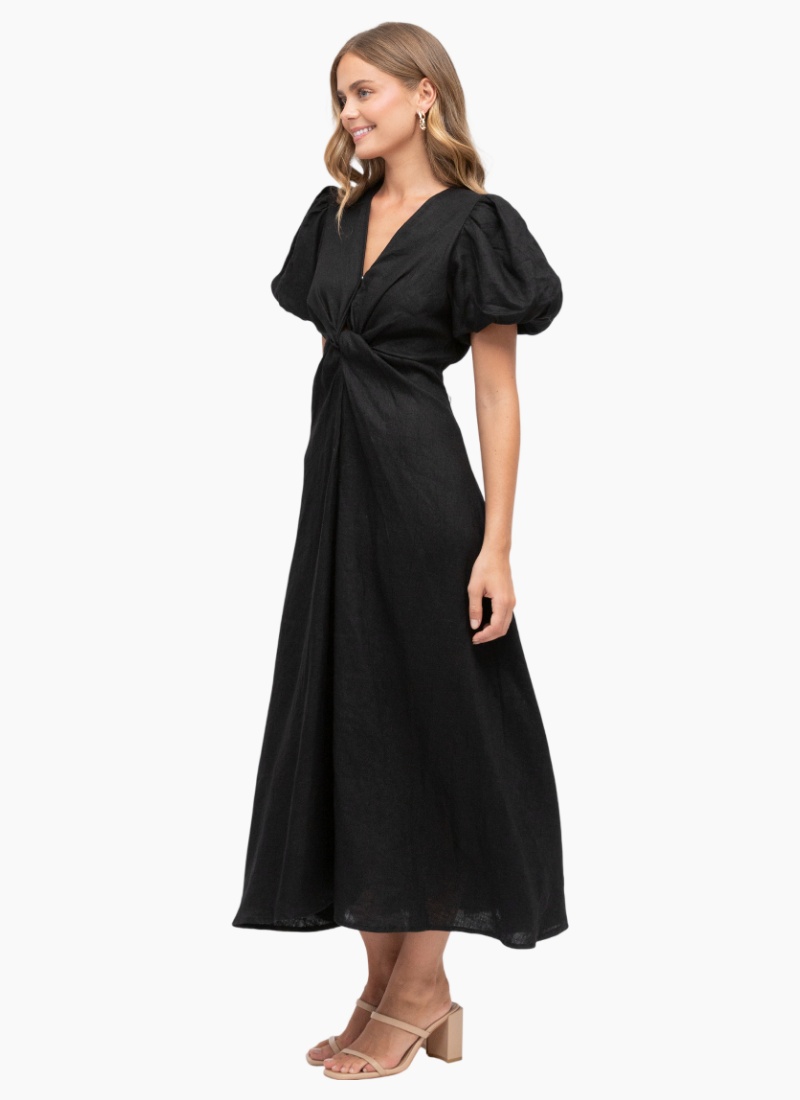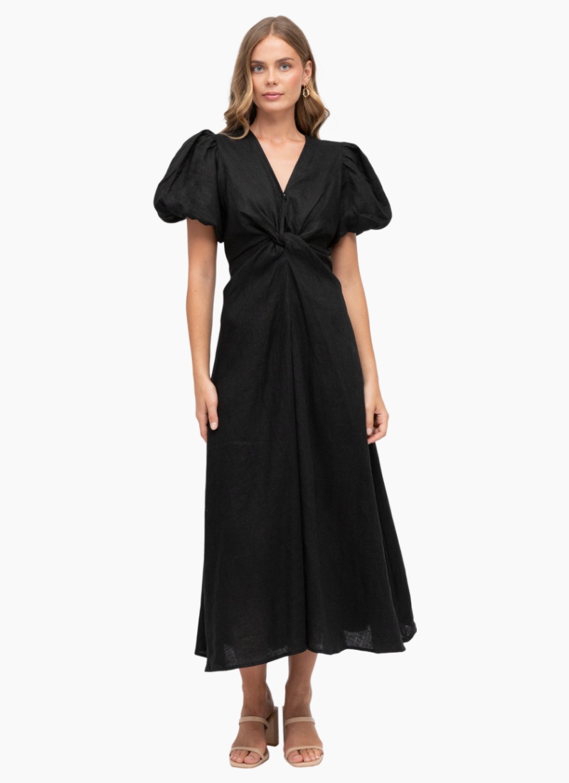 Step into sophistication with The Twist Dress by White Closet. Designed to offer both style and supreme comfort, this midi dress is meticulously made from 100% pure linen, ensuring lightweight breathability and a beautiful drape—perfect for warmer days.The striking design centers on a deep V-neckline and an elegant front twist detail that cleverly cinches the waist, creating a flattering hourglass silhouette. Statement puff sleeves add a touch of romantic drama, while the relaxed, flowing A-line midi skirt ensures freedom of movement. Finished in timeless Black, this dress transitions seamlessly from a daytime lunch to an evening event. Key Features: Colour: Classic Black Design: Flattering V-neckline with a waist-cinching front twist. Sleeves: On-trend puff sleeves with comfortable elasticated cuffs. Fit: True to size -Relaxed A-line midi skirt for a comfortable, elegant fit.