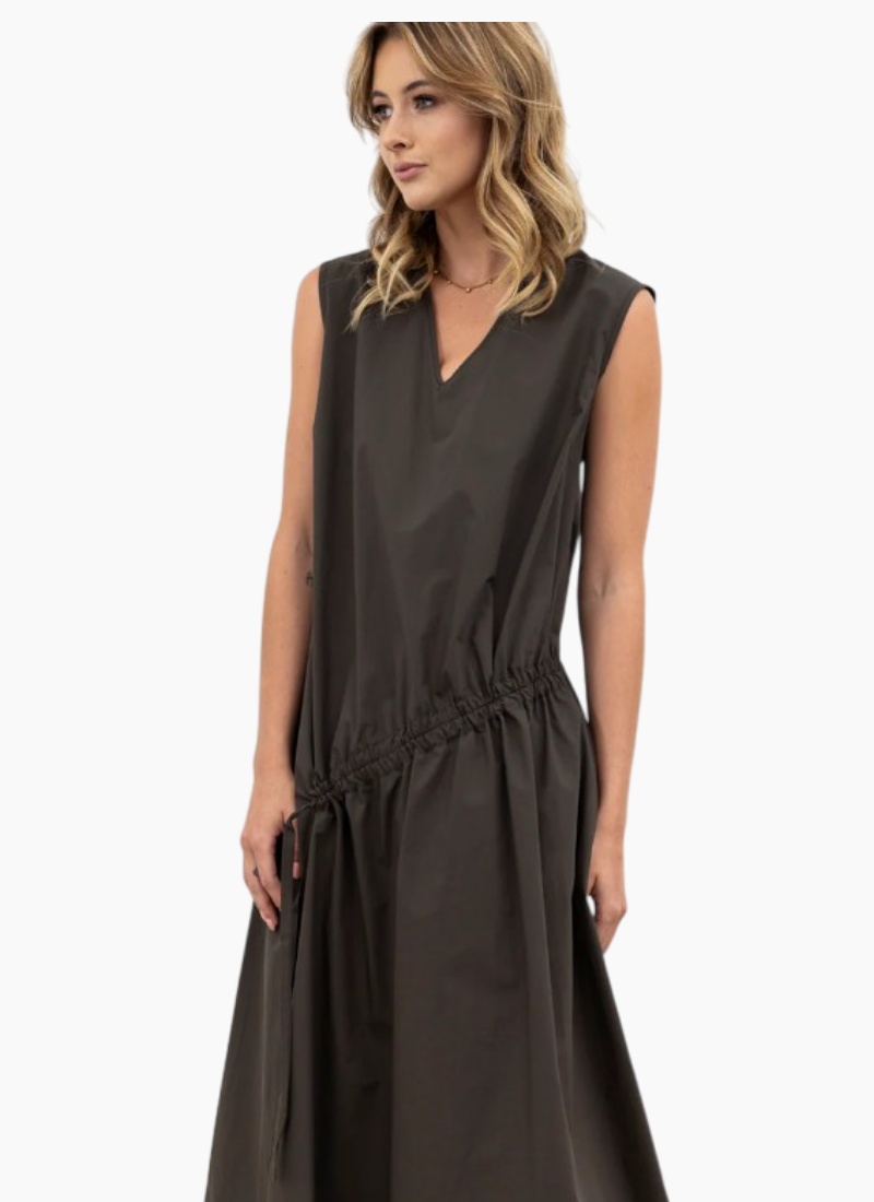 - Sleeveless V-neck silhouette with an adjustable diagonal drawstring gathering to add shape and modern detailing