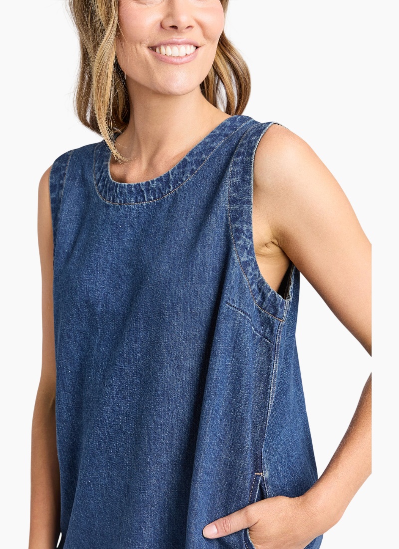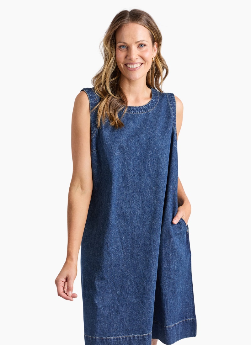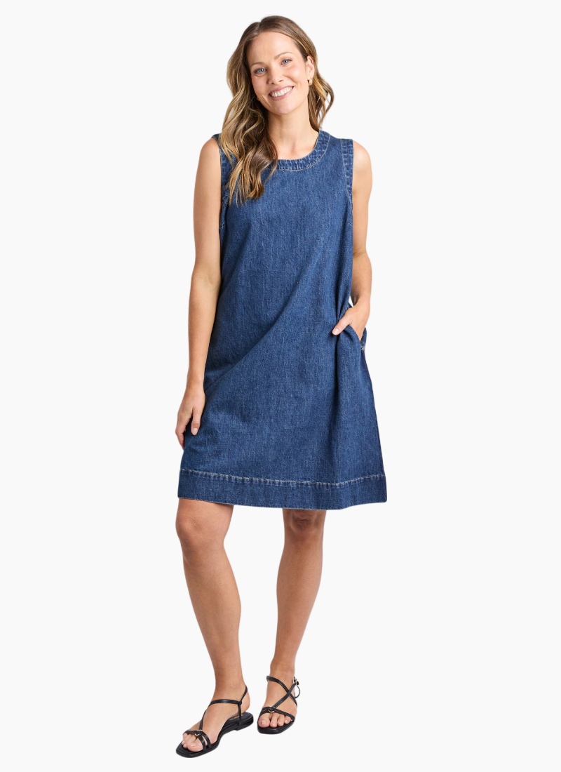 A flattering and versatile A-line denim dress designed for effortless everyday wear. The Sonny Denim Dress features a soft washed finish, practical side pockets, and a button-open for easy styling. Finished at an above-knee to knee length, this relaxed yet polished piece is one you’ll reach for time and time again.Relaxed, easy everyday fit Casual denim dress with Elm’s signature laid-back aesthetic