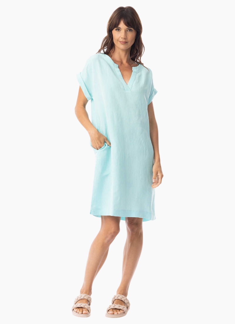 - Features gentle cap sleeves, a relaxed V-notch neckline and handy side pockets for everyday ease