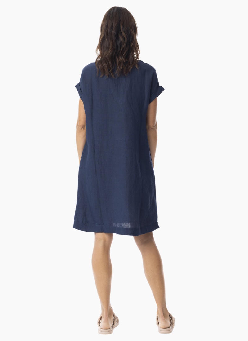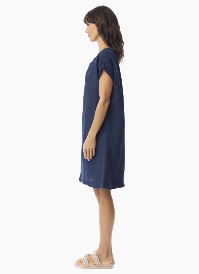 Introducing the Escape Linen Solid Dress Shift cap slv. This effortless navy shift dress is crafted from breathable linen for relaxed, all-day comfort.