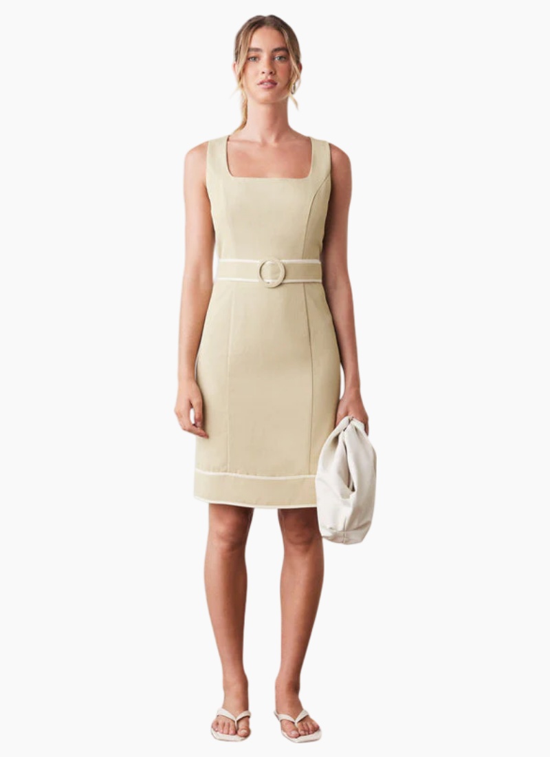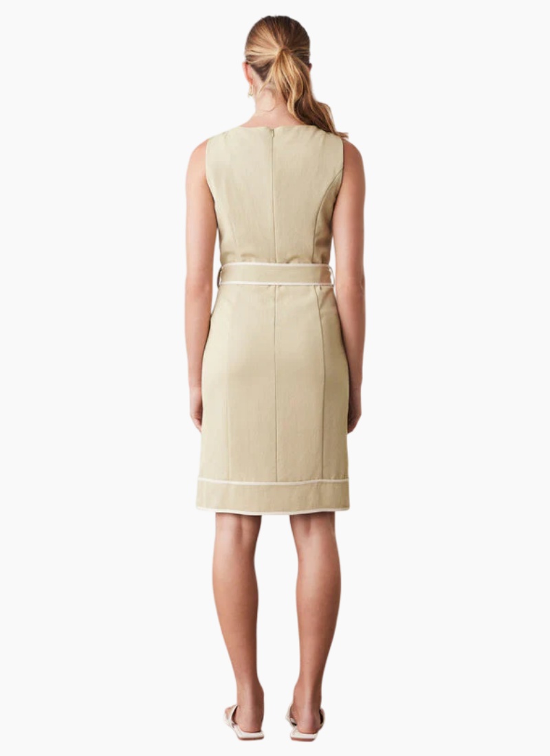 - Subtle contrast piping and a belt-like trim define the waist for a polished, feminine look