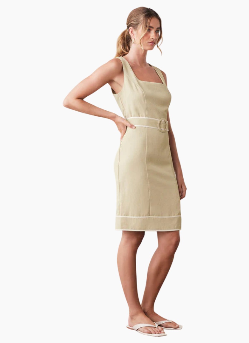 Introducing the Esmaee Voyage Dress from Esmaee. This sleek, sleeveless shift dress in beige offers refined daytime sophistication.