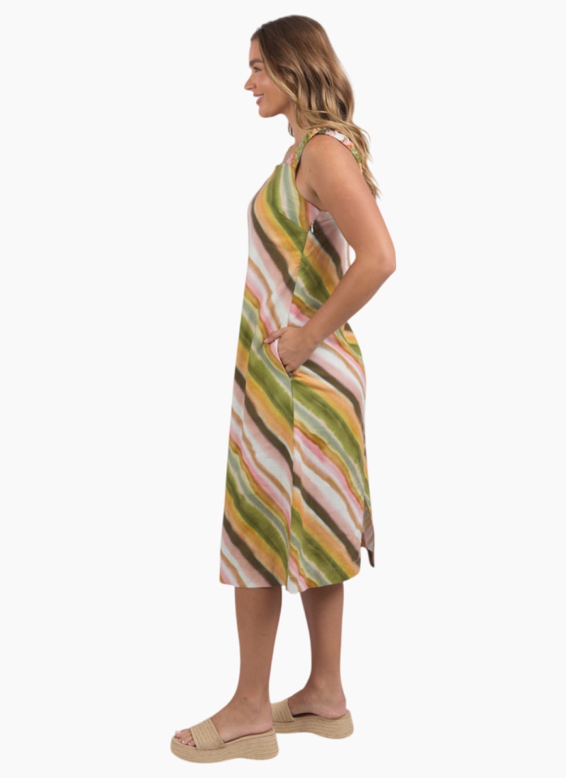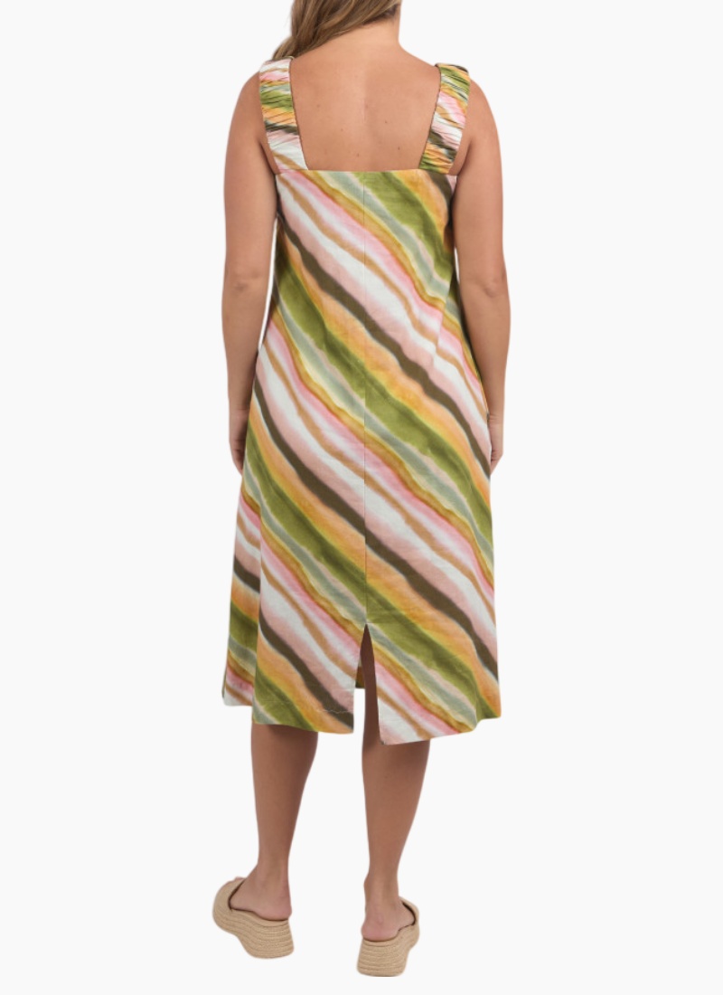 Foxwood Horizon Dress. Brighten your wardrobe with the Horizon Dress featuring our Foxwood exclusive all-over printed stripe. Crafted from a soft linen viscose blend, it’s designed with elastic sleeves and handy side pockets for effortless comfort and style. Perfect for easy days and weekend adventures.