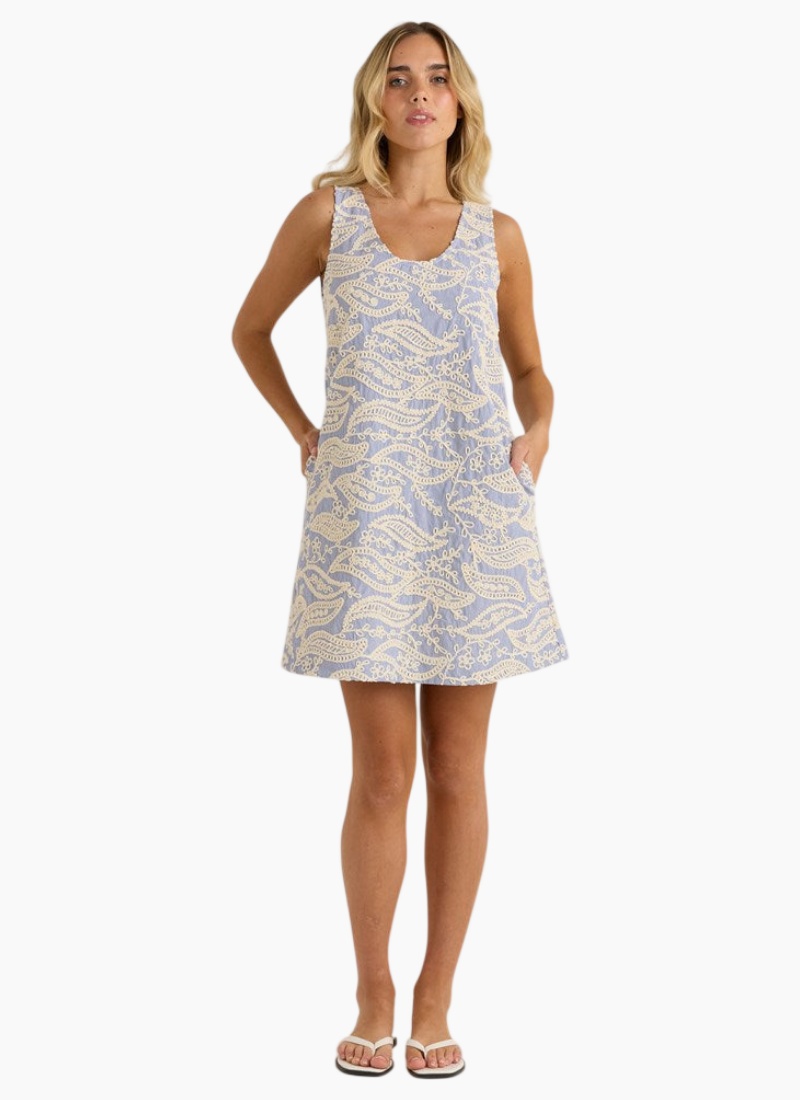 Soft embroidery and a relaxed shift shape give this dress a polished feel without losing comfort. Wide straps and pockets keep it practical and easy to wear all day long. It’s an effortless staple with stylish charm.