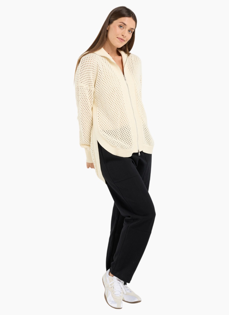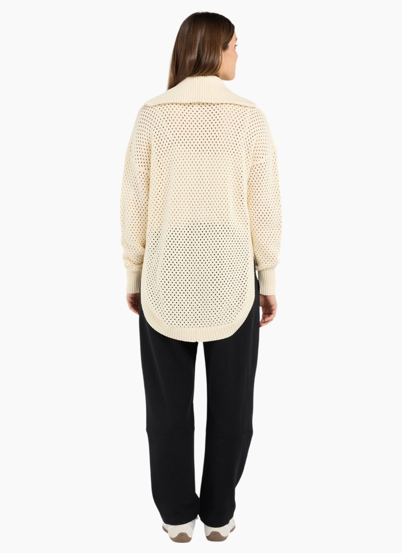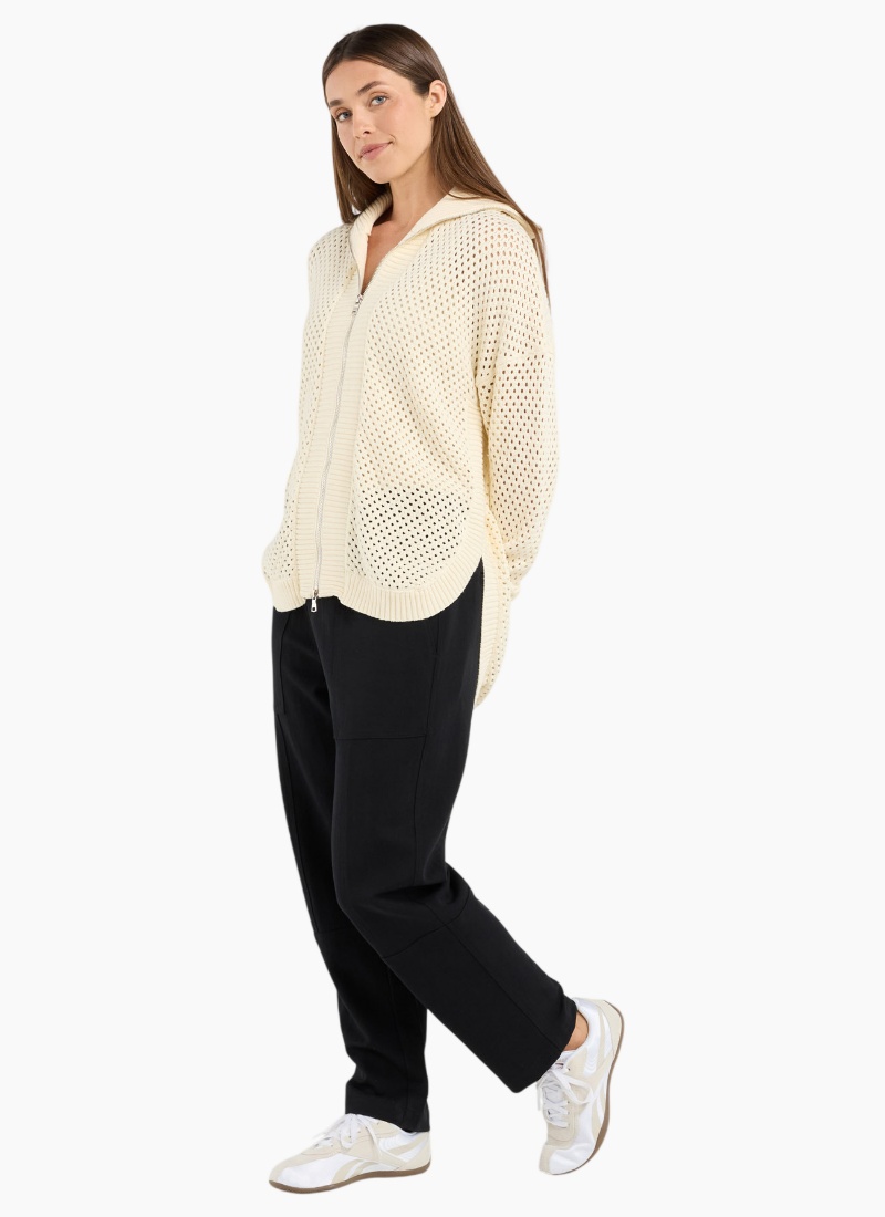 Introducing the Lexington Scoop-Winter White from Blackstone. This relaxed, open-knit zip hoodie is a breezy layering staple for cooler days.