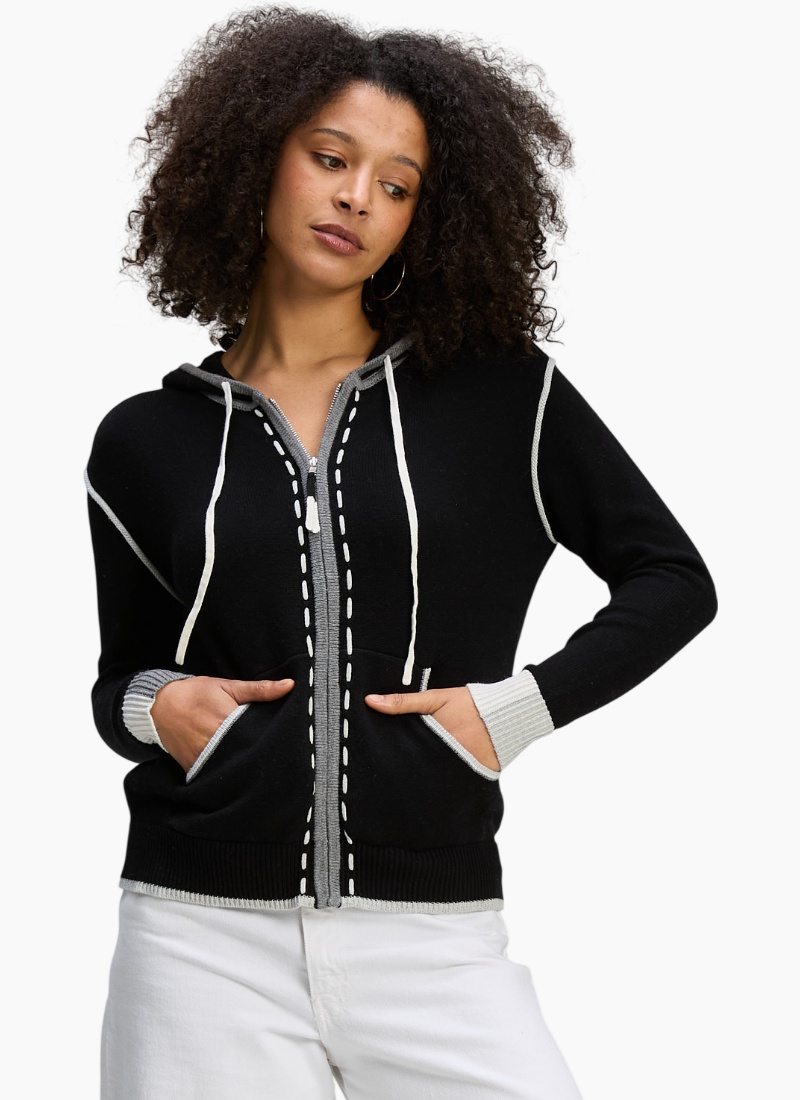 Introducing the Threaded Hoodie Black from Zaket & Plover. This luxe knitted hoodie blends casual comfort with refined contrast detailing for an elevated every-day piece.