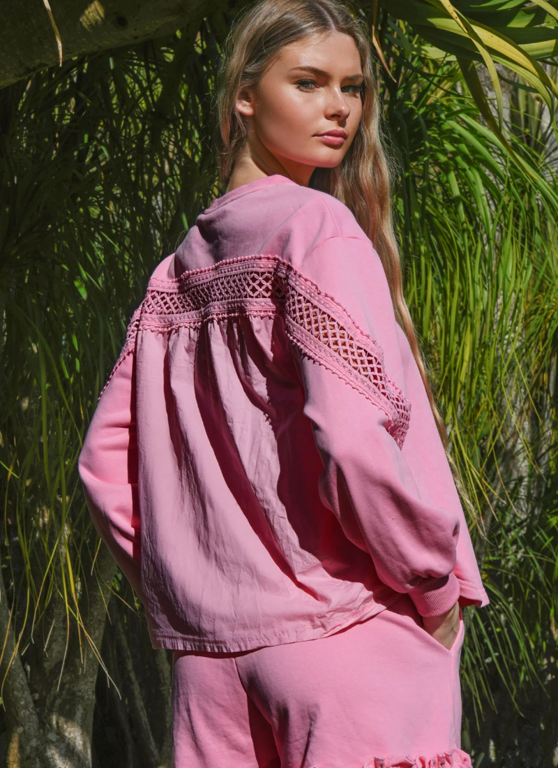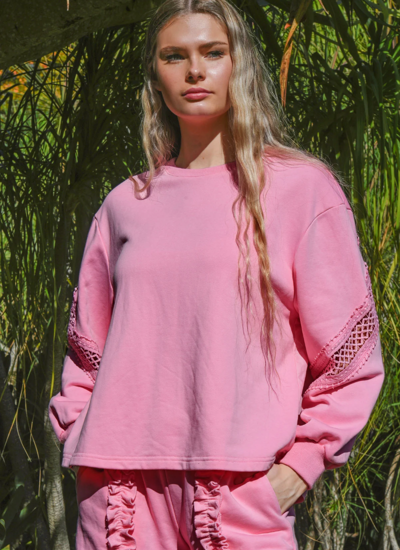 - Delicate open crochet panels on the sleeves add a subtle, stylish detail to the pink colourway
