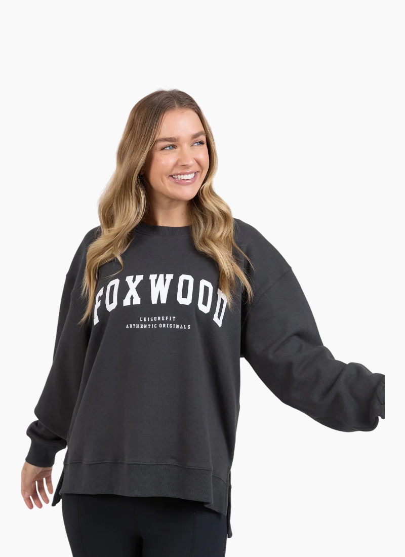- Dark Grey from Foxwood. This relaxed, varsity-inspired sweatshirt is a wardrobe staple that marries comfort with bold graphic style.