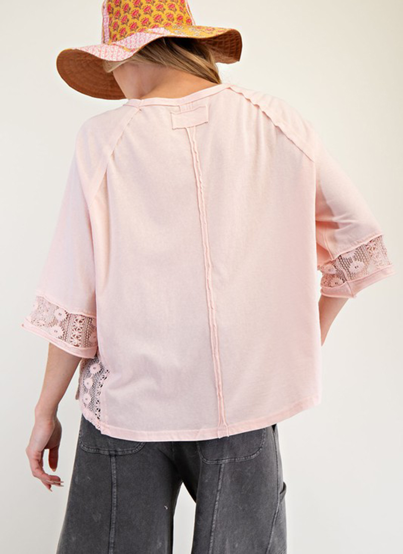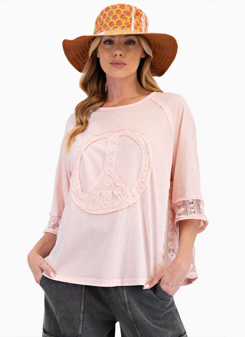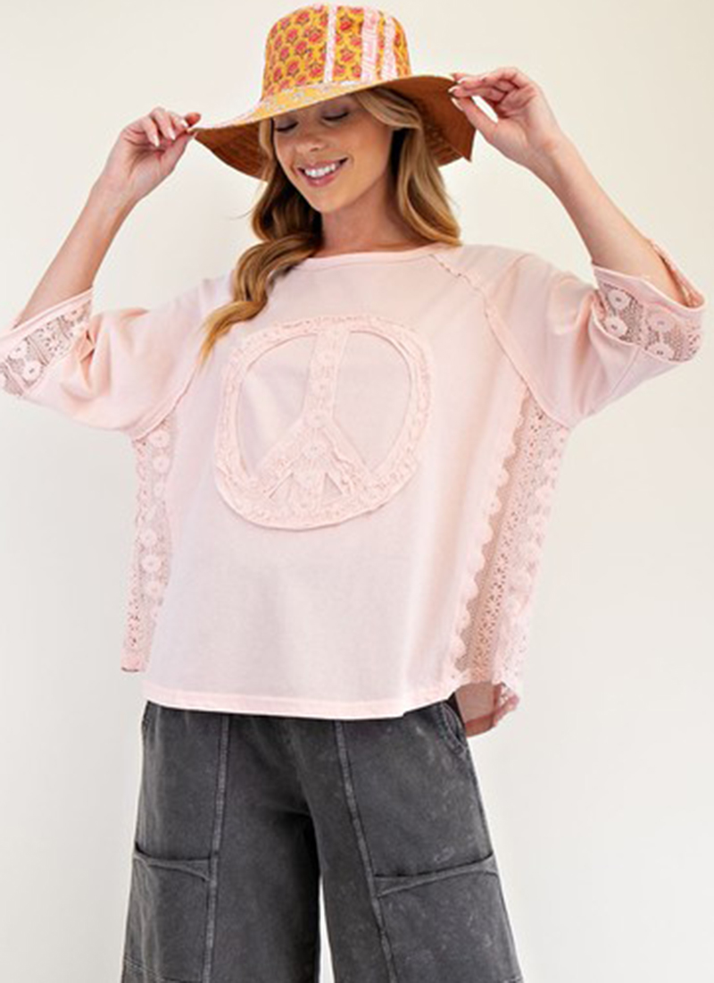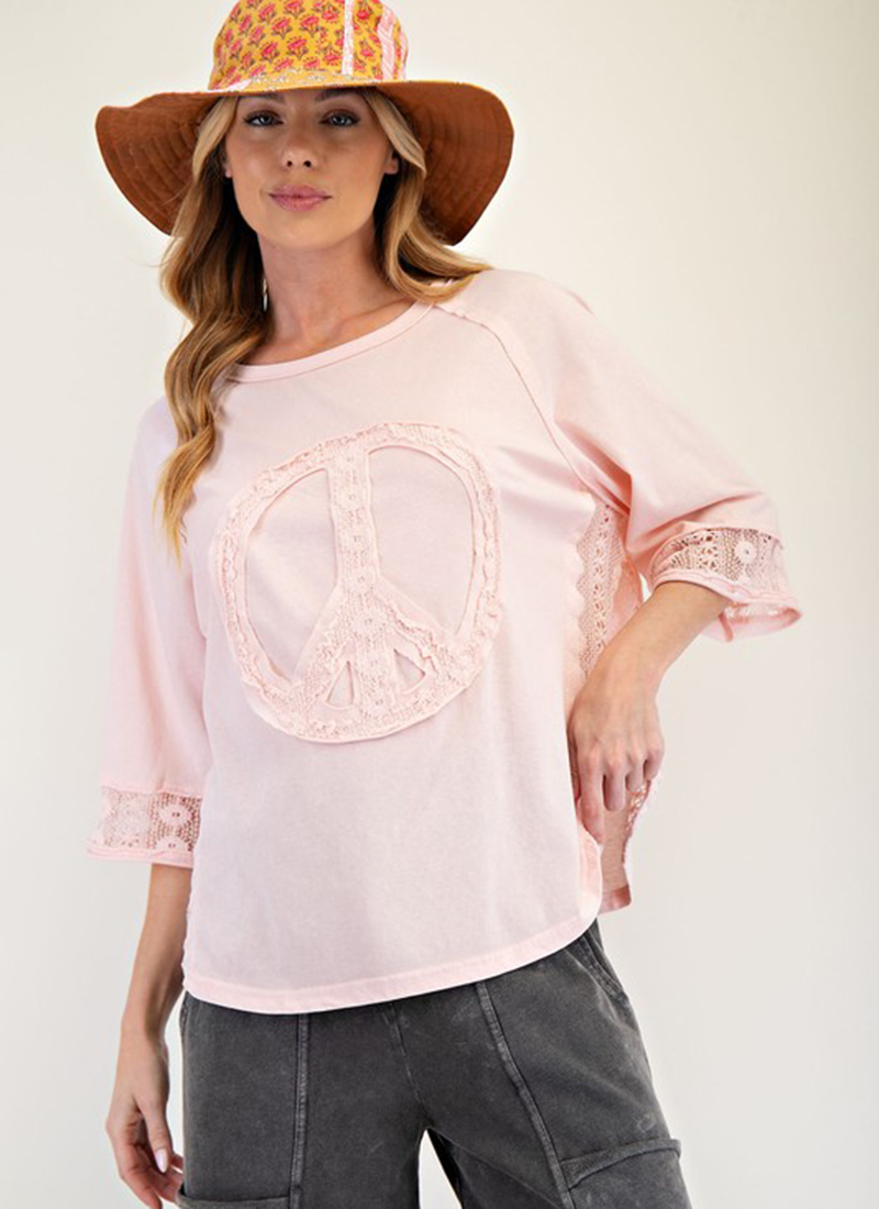 Mineral washed cotton knit top with raised crochet peace patch detail.