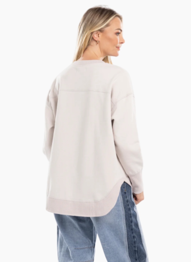 - Relaxed silhouette with dropped shoulders and a ribbed crew neckline for easy layering