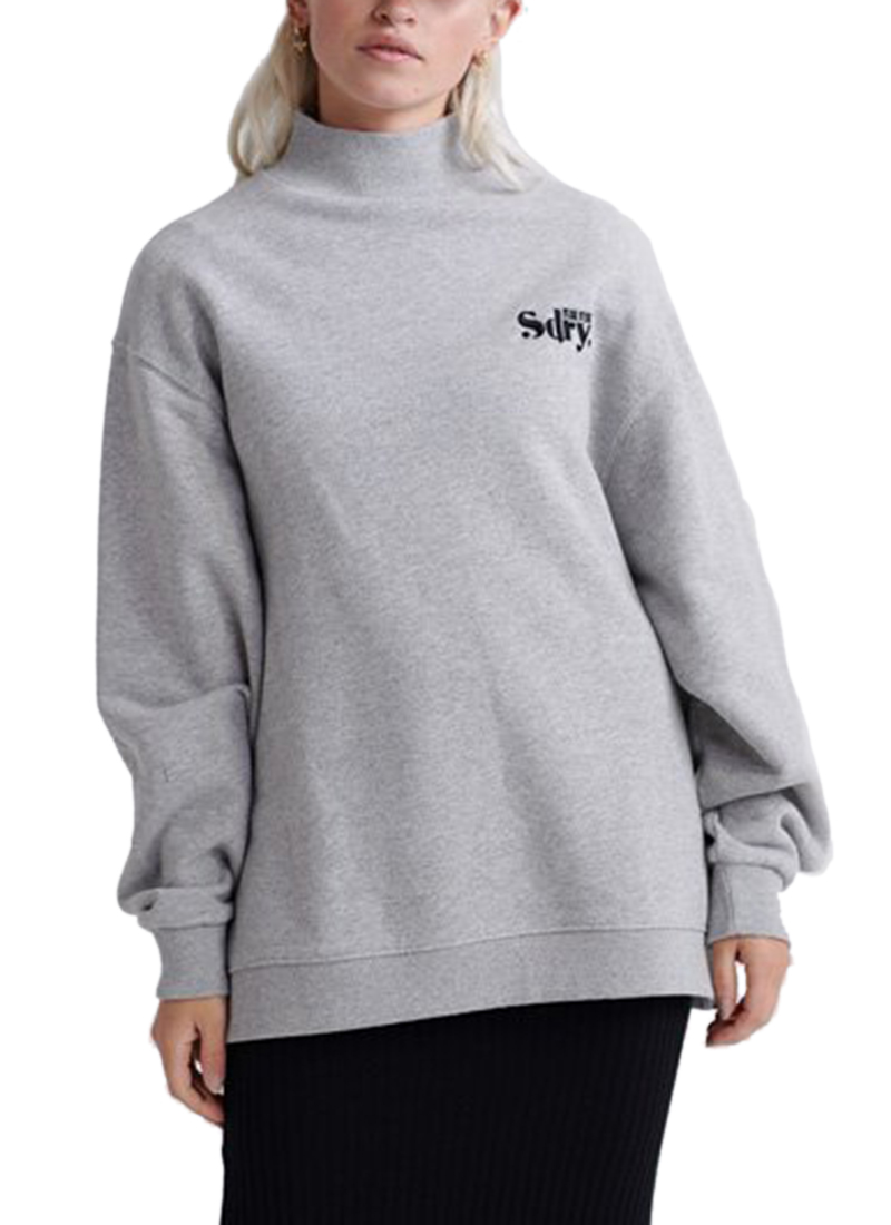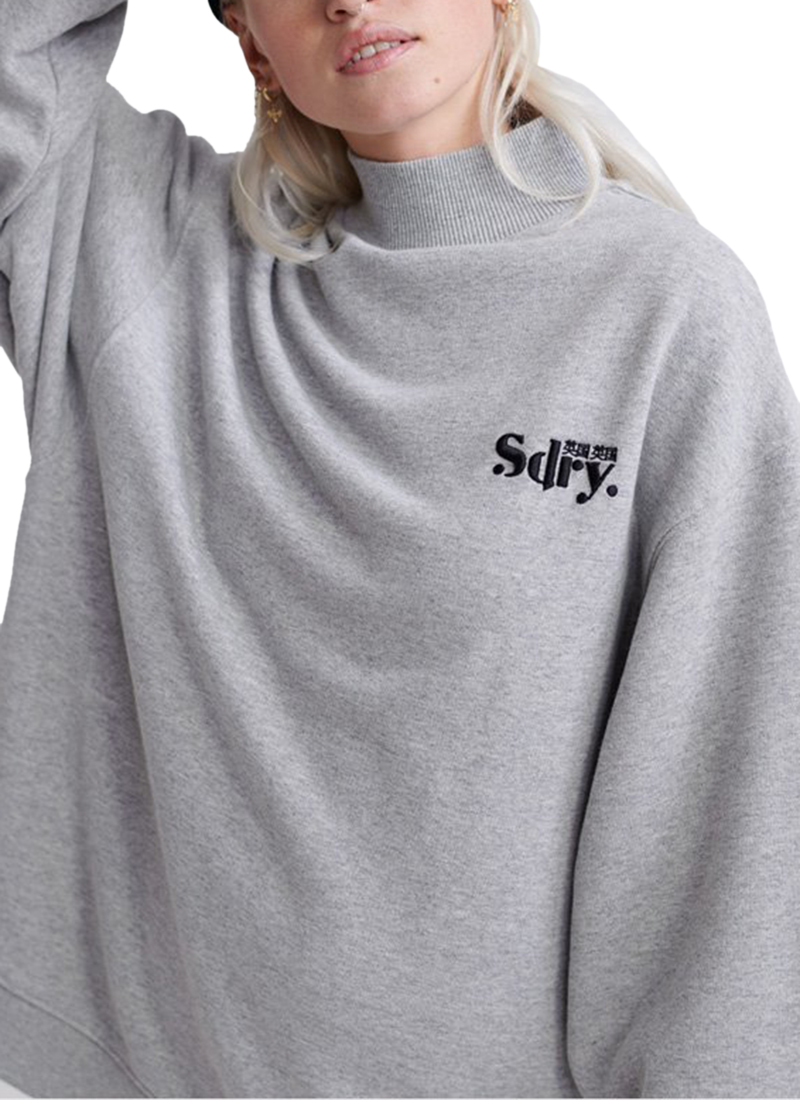 Superdry women's Ana high neck crew sweatshirt. A high neck sweatshirt featuring long, wide cut sleeves, split side seams and a ribbed collar, cuffs and hem. Completed with an embroidered Superdry logo on the chest, a Superdry logo tab on the hem and embroidered Japanese detailing on the back below the neck. A statement, throw on and go piece that will look great over jeans, cycling shorts or midi skirt for an up-styled, casual look.