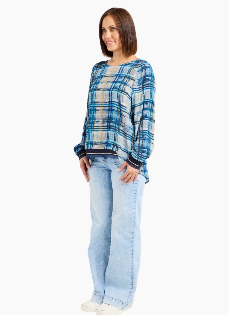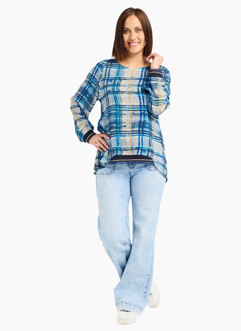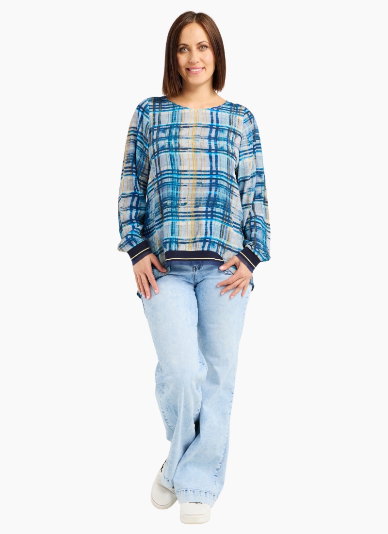 Our all-time classic long sleeve top gets a fresh update in a cool, modern ocean plaid. Designed with ribbed, elasticated cuffs and a front hem for comfort and shape, it’s finished with a round neckline for an easy, timeless look. 50% Viscose 50% Rayon