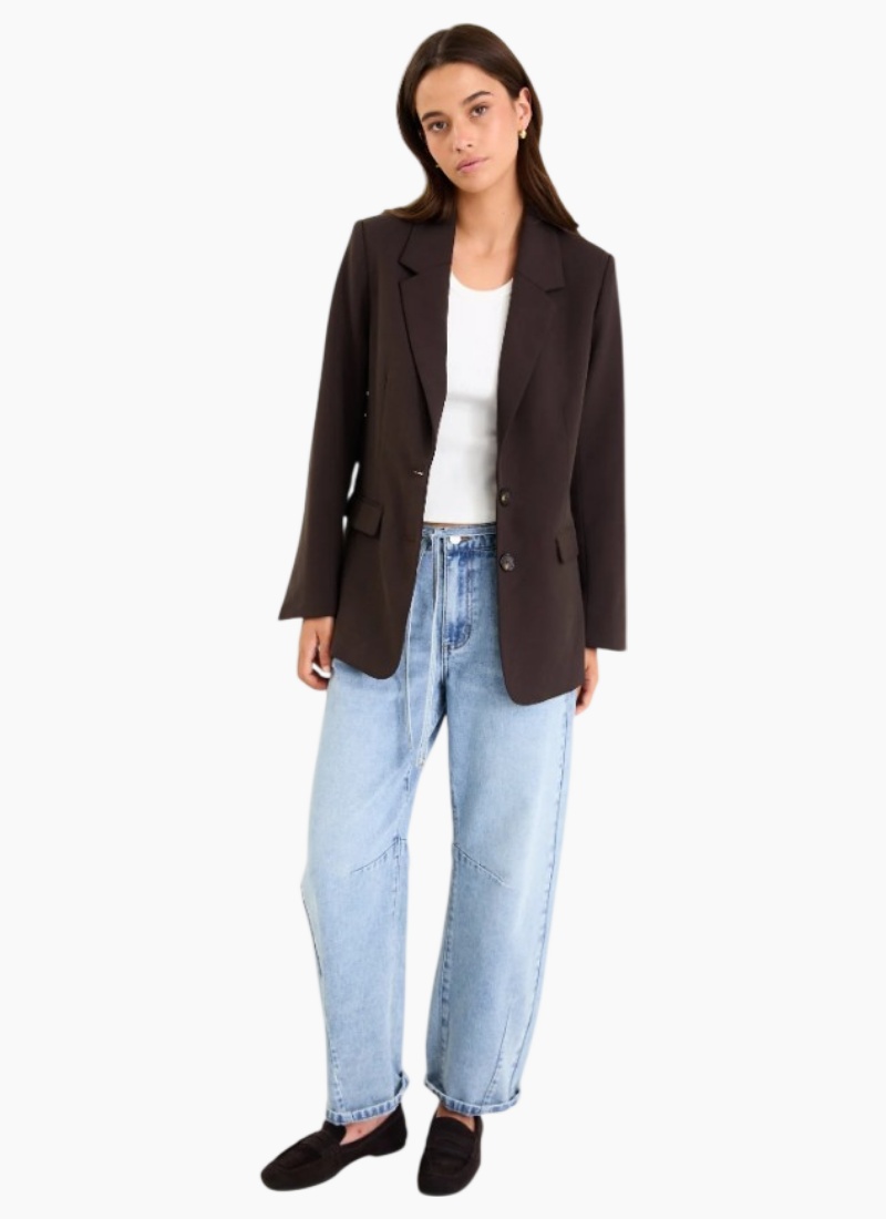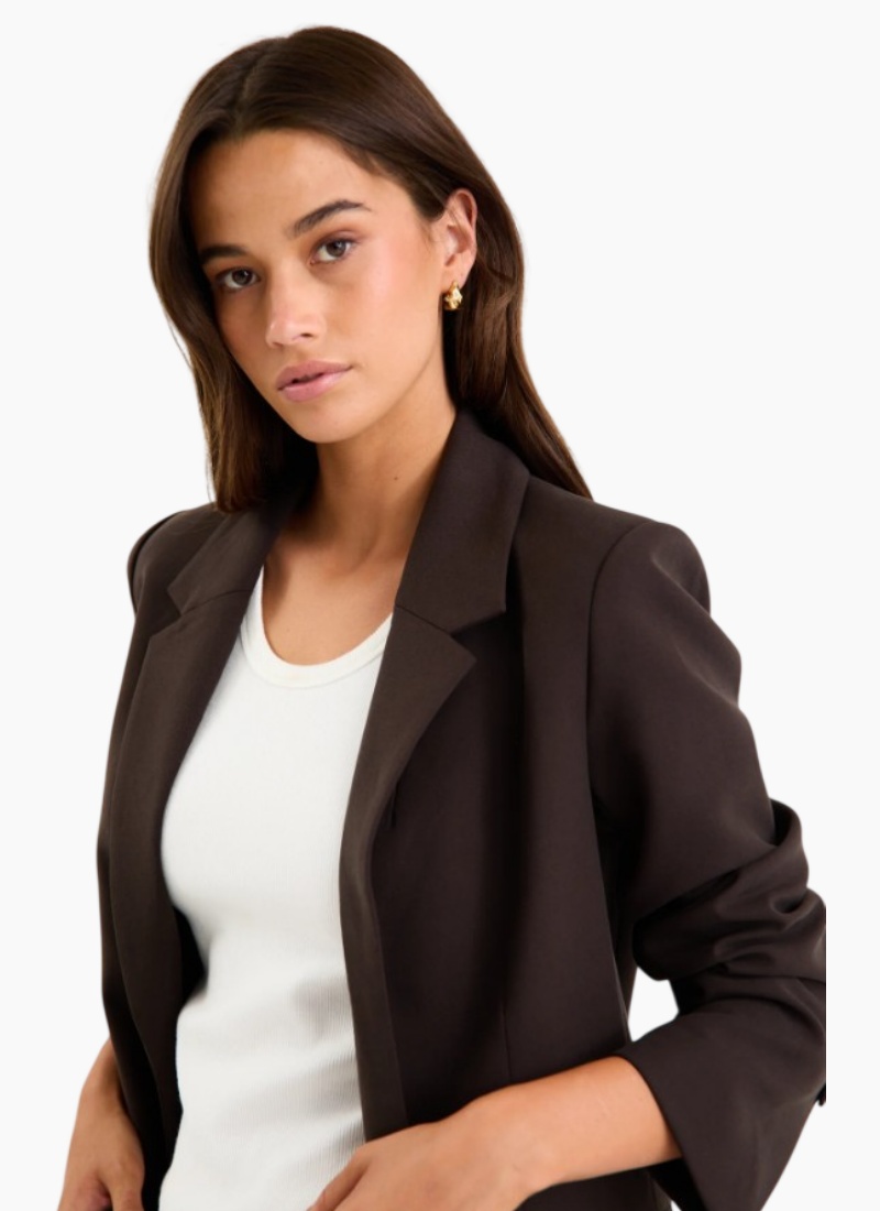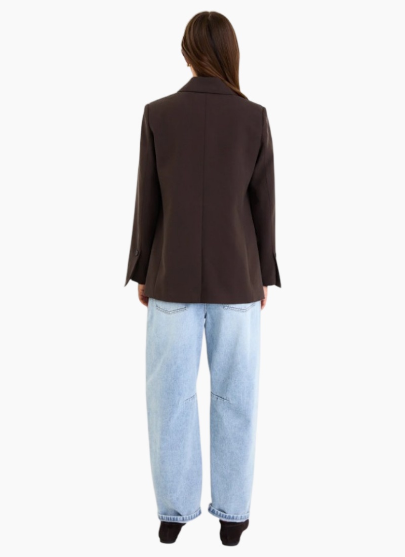 A sleek dark chocolate blazer designed to elevate your everyday wardrobe. Tailored with a refined two button front and subtle vented sleeves, it offers a polished finish that works effortlessly for office days or dressed up evenings.