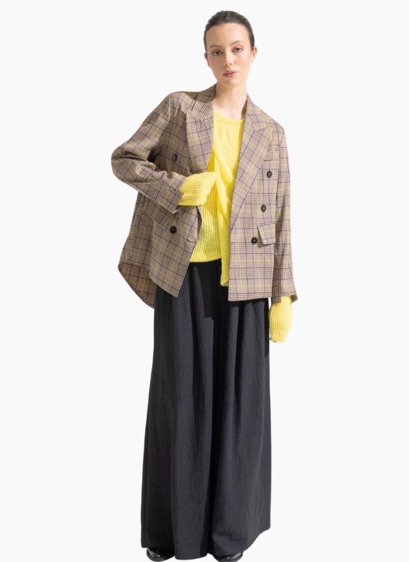 - Double-breasted, boxy silhouette with notch lapels and flap pockets for a polished blazer finish