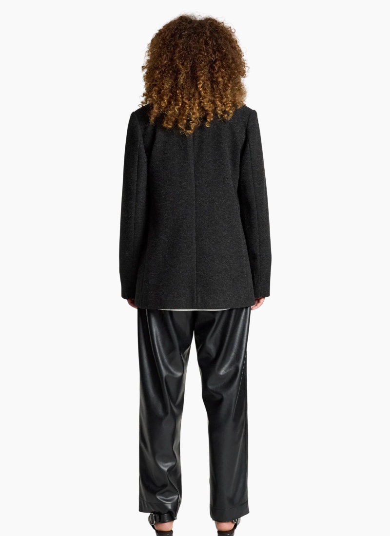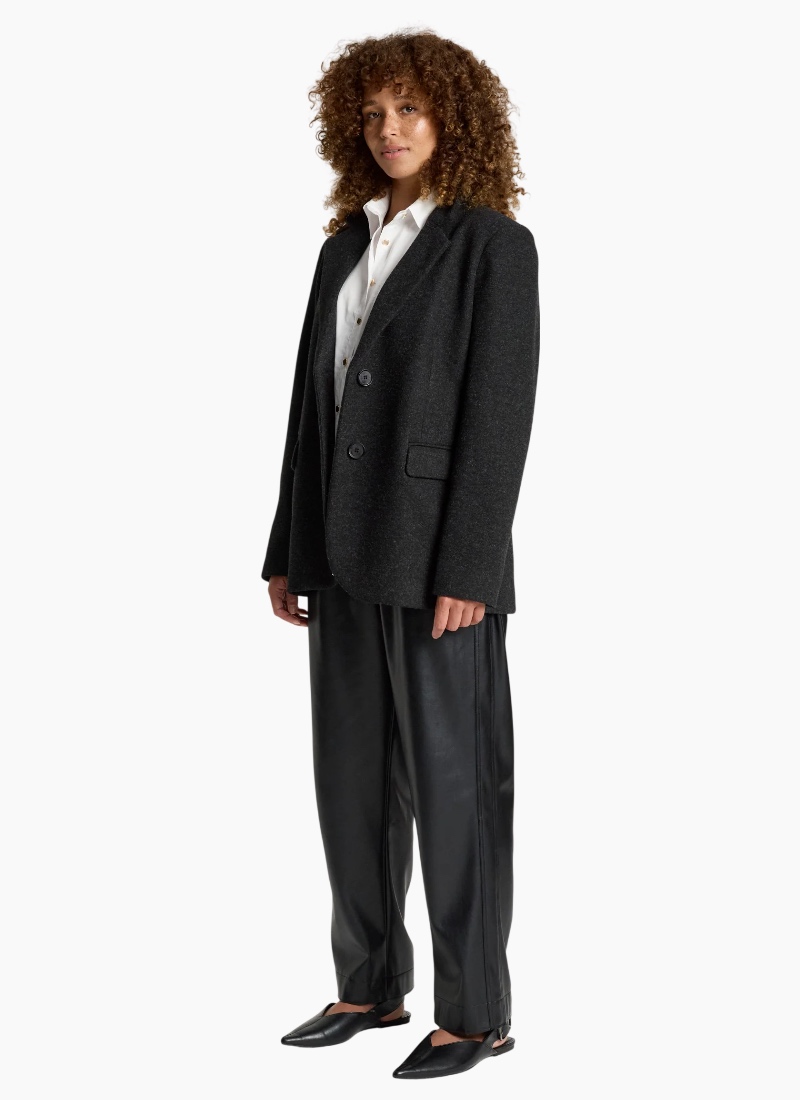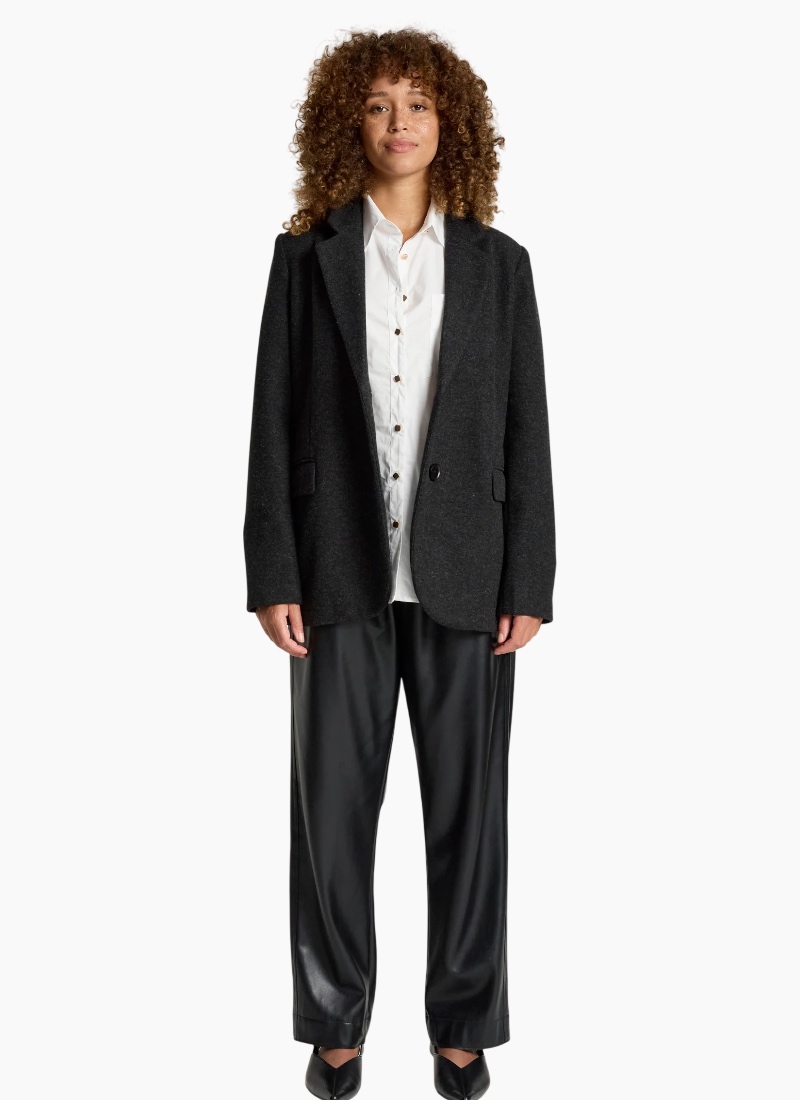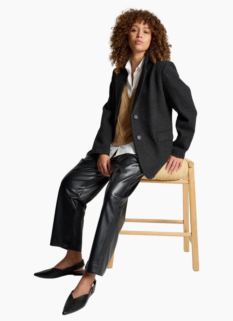 A sophisticated, fully structured blazer designed for polished winter dressing. Crafted from a wool-look polyester–rayon blend, this tailored style offers warmth without added bulk. With clean lines and a fitted silhouette, it’s perfect for both professional settings and elevated everyday wear. Dress it down with denim or pair with the Amina Pant and a crisp white shirt for effortless corporate style. Design Features Fully structured, tailored silhouette DTM (dye-to-match) button closure Fully lined for comfort and structure Wool-look fabrication Designed for polished winter layering