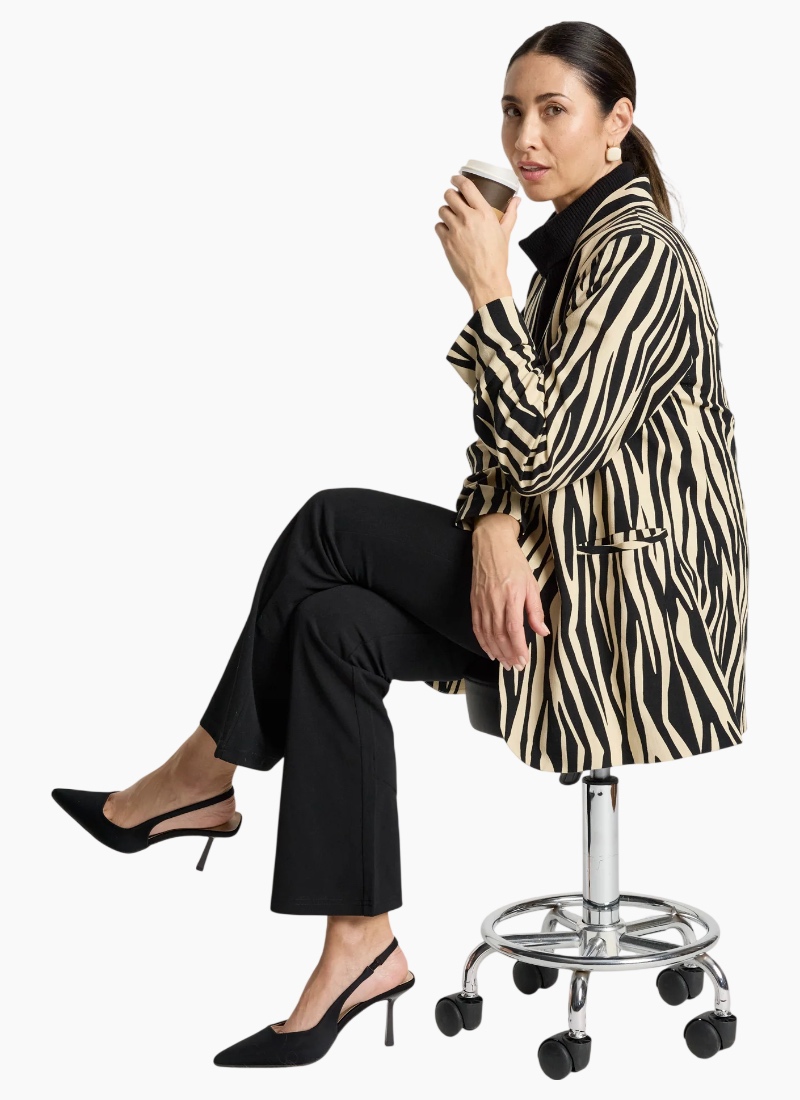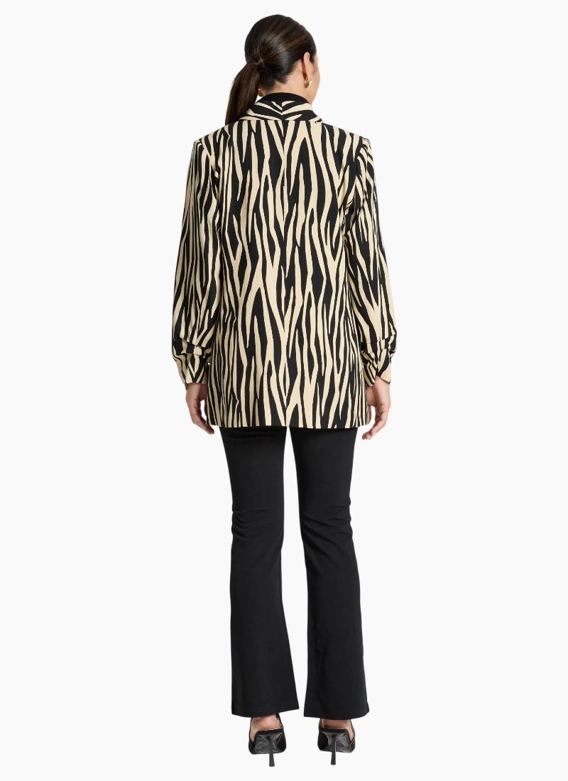 A softly structured blazer crafted from a soft-washed cotton–rayon blend. Designed with a shawl lapel, ruched cuff detailing and a fully lined interior for smooth layering. The printed finish adds subtle statement appeal while maintaining a refined, easy-to-wear silhouette. Finished with practical pockets. Features Shawl lapel Ruched cuff detailing Fully lined for comfortable layering Pockets Soft-washed cotton/rayon blend Relaxed, structured shape Care Cold gentle wash recommended.
