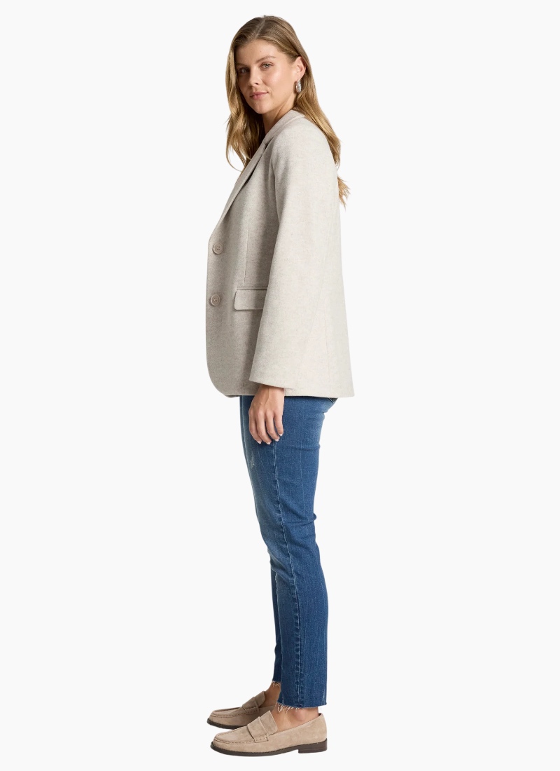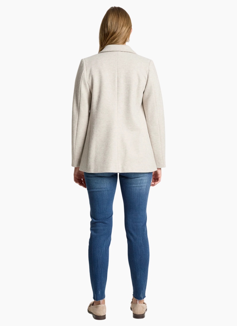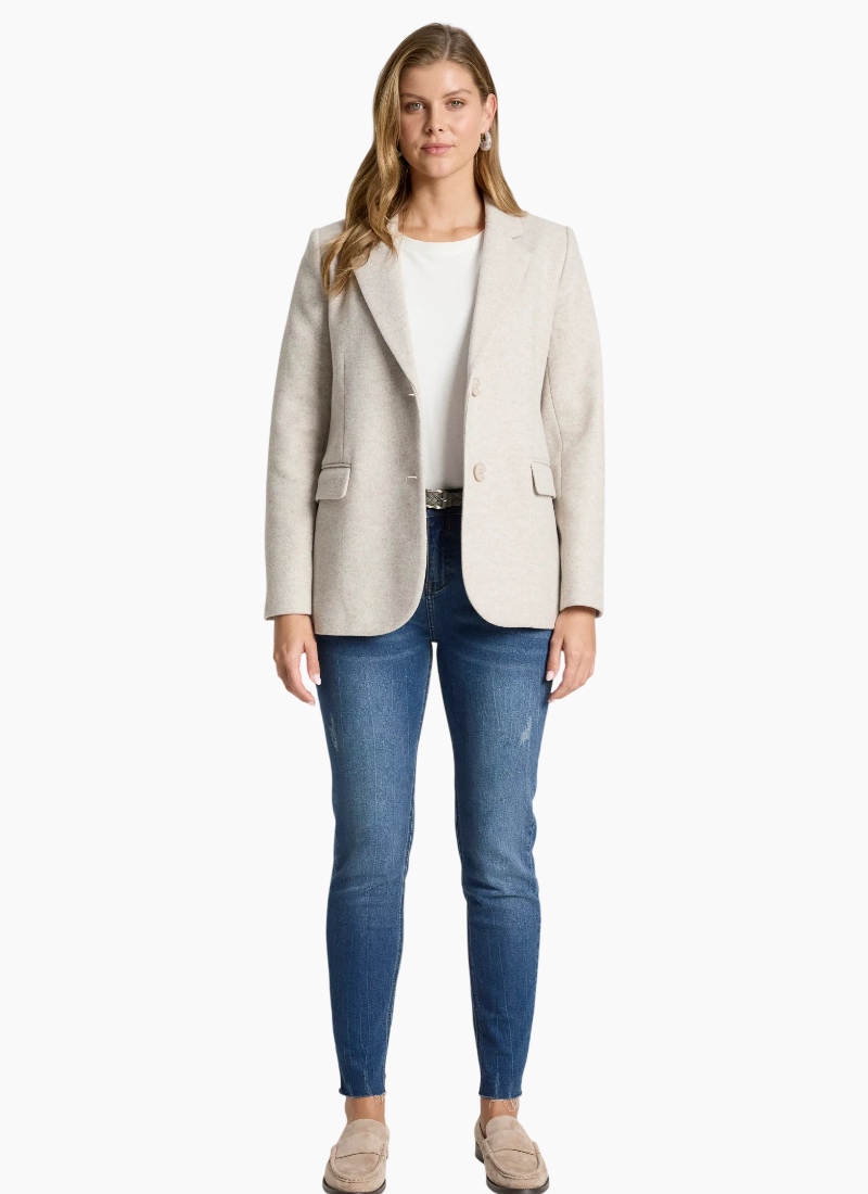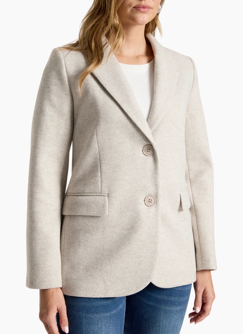A sophisticated, fully structured blazer designed for polished winter dressing. Crafted from a wool-look polyester–rayon blend, this tailored style offers warmth without added bulk. With clean lines and a fitted silhouette, it’s perfect for both professional settings and elevated everyday wear. Dress it down with denim or pair with the Amina Pant and a crisp white shirt for effortless corporate style. Design Features Fully structured, tailored silhouette DTM (dye-to-match) button closure Fully lined for comfort and structure Wool-look fabrication Designed for polished winter layering
