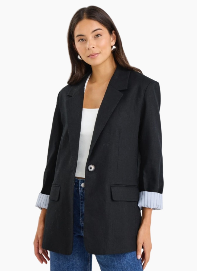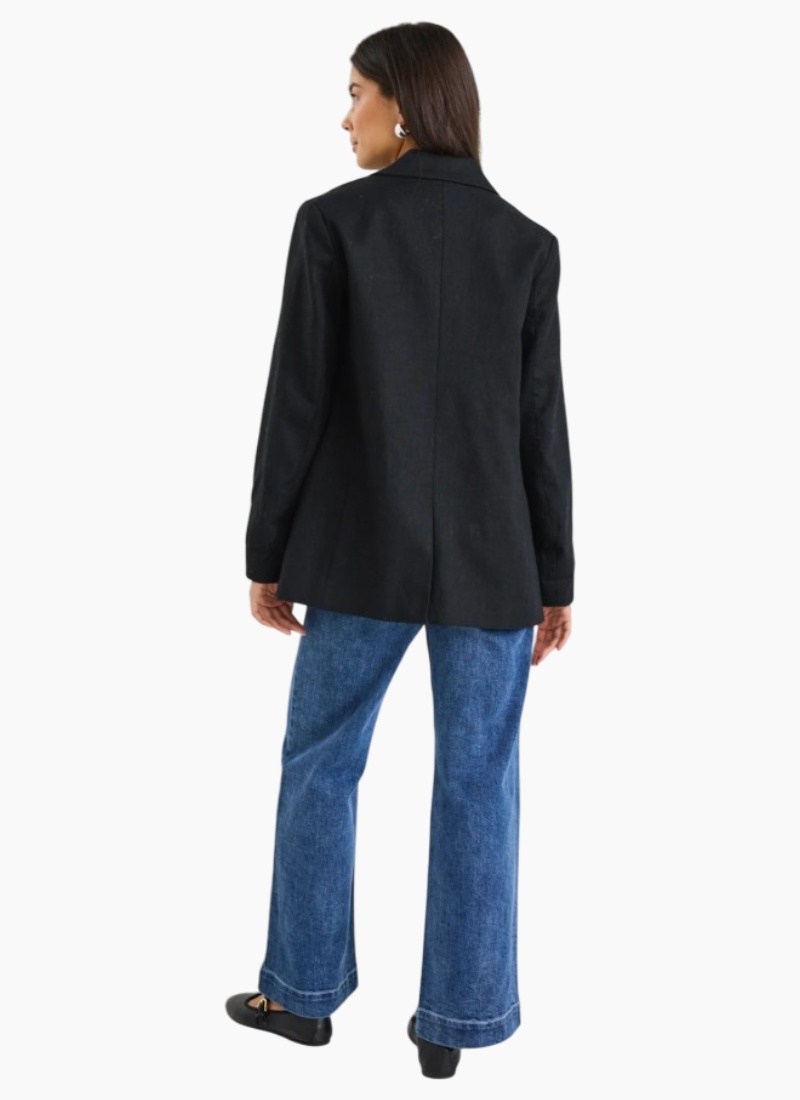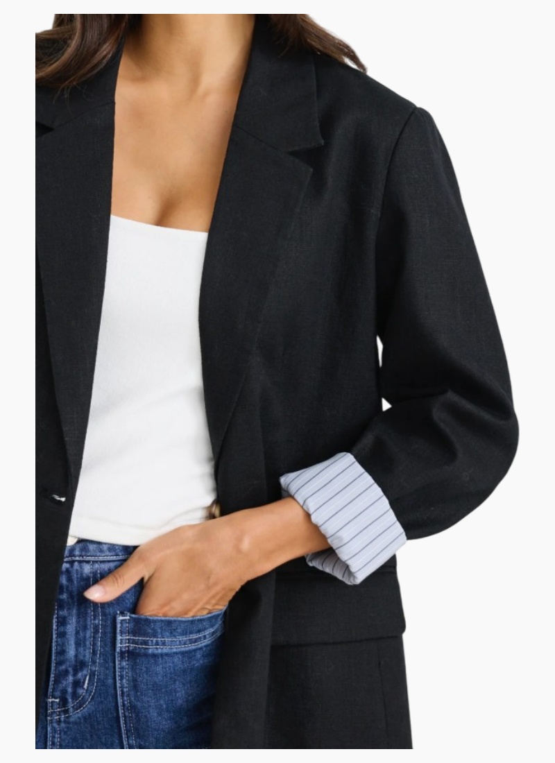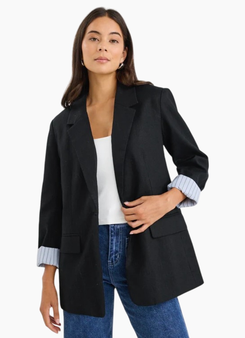 The Dock Black Blazer by Ivy & Jack is a versatile women's blazer that works for both casual and formal outfits. Made from 100% ramie, it has a smooth black finish with striped cuff detailing for added style. Wear it oversized with jeans for a relaxed look, or fitted with tailored trousers for a polished outfit. Fully lined for comfort, this blazer is a dependable choice in women’s blazers.