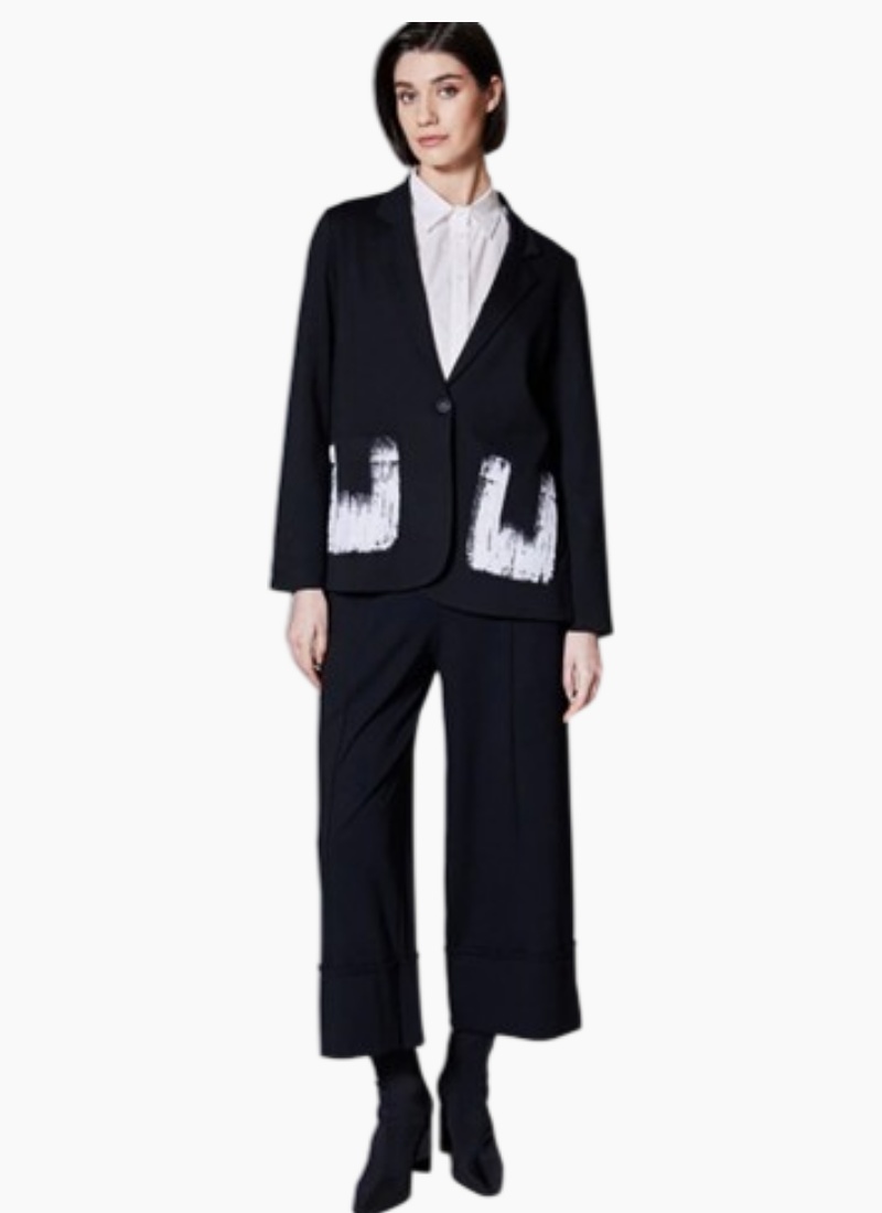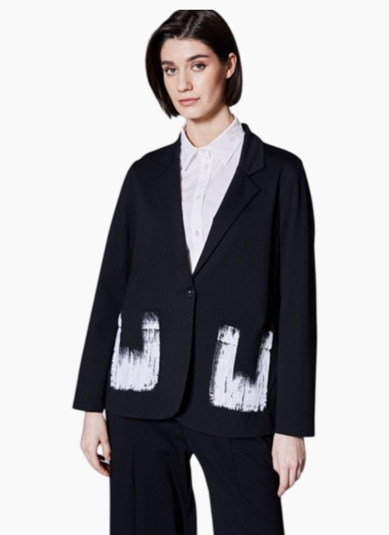 PERUZZI brush stroke jacket featuring a bold artistic paint design and double front pockets. It's a statement layer with modern appeal.It super stretchy for added comfort. Made in Italy.
