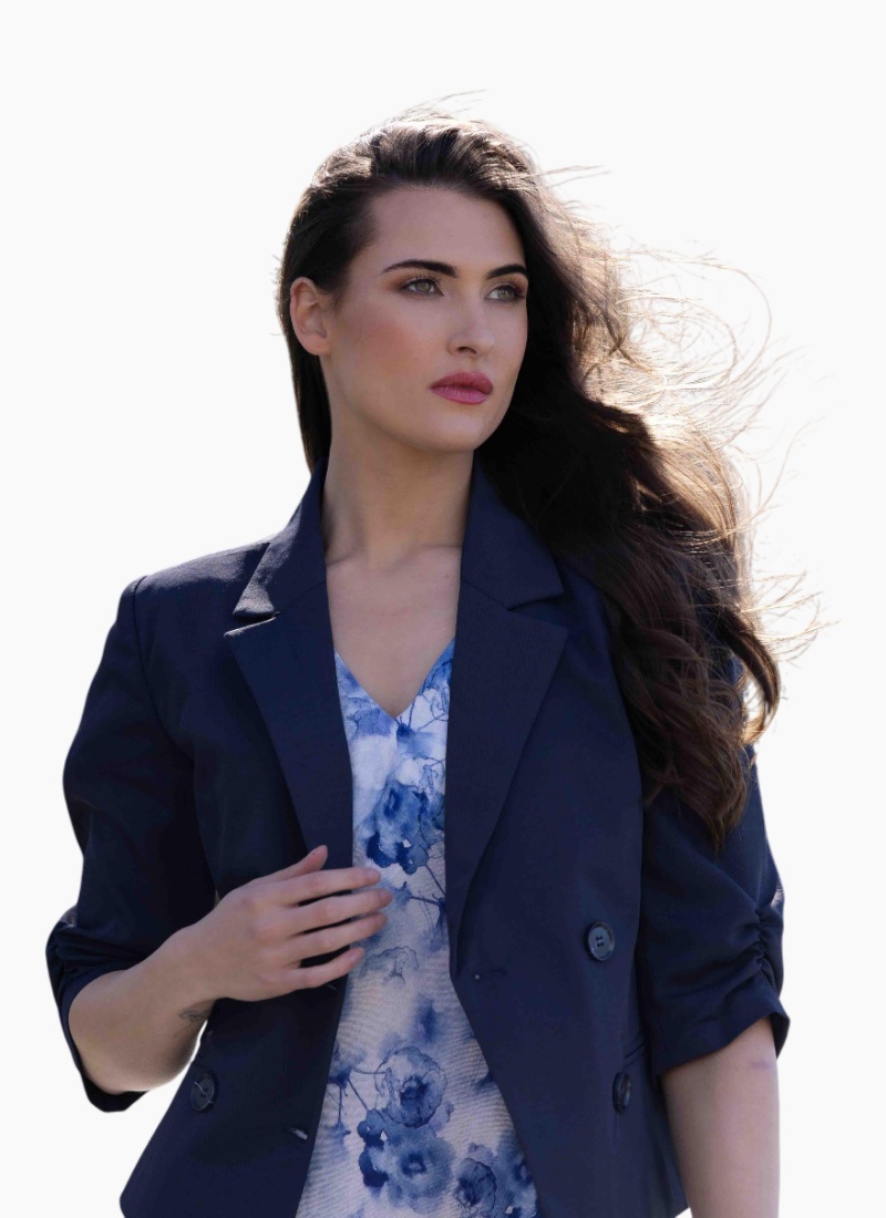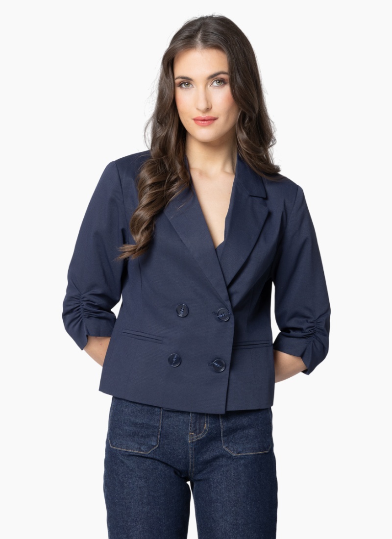 - Tailored lines with slightly ruched sleeves create a modern, feminine finish — pair with trousers or a dress for instant polish
