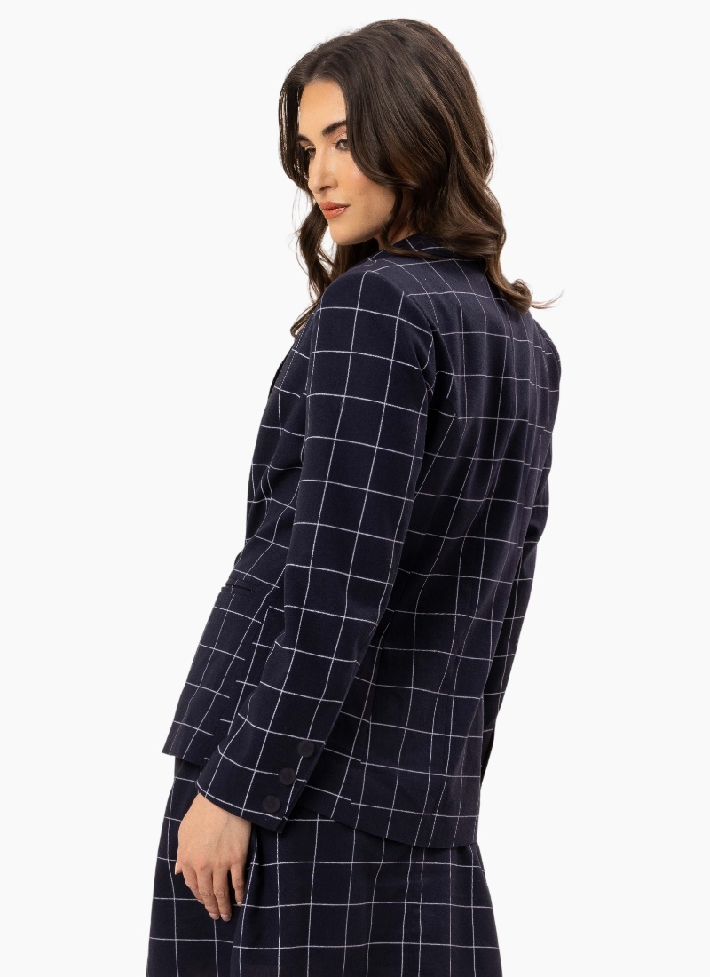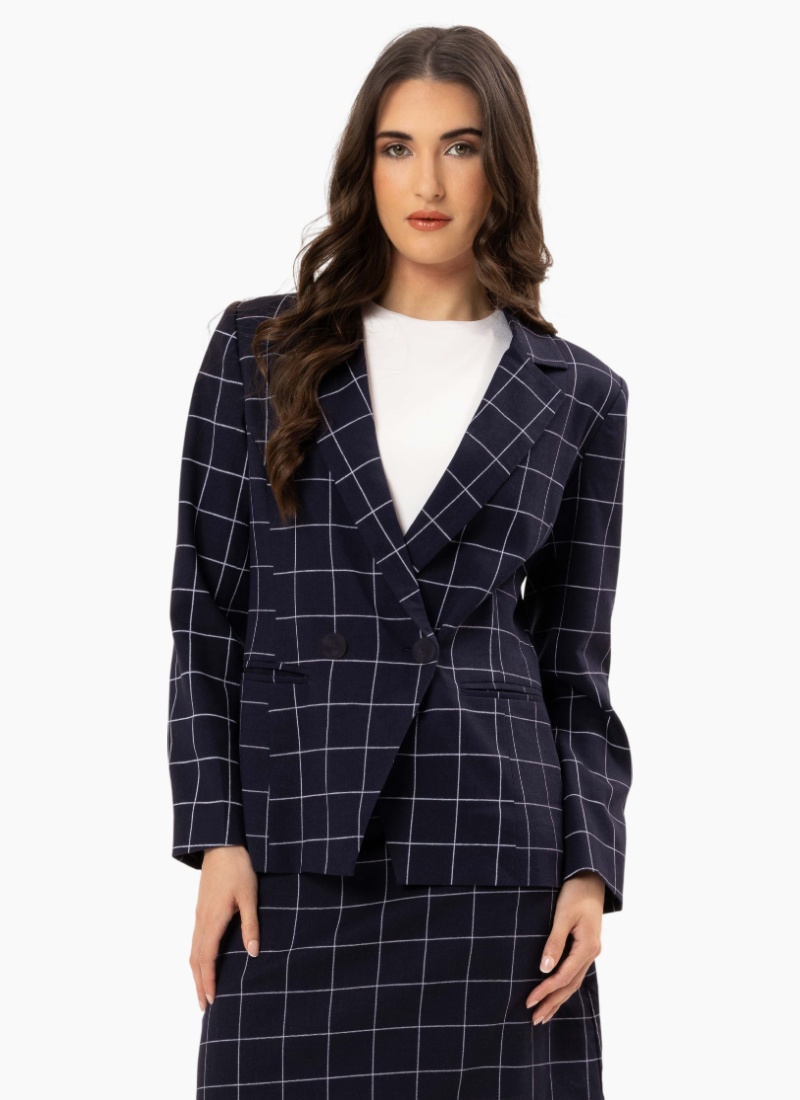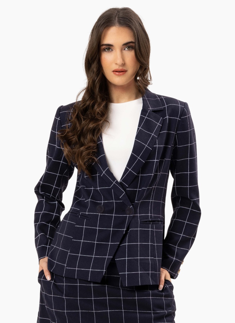 Redefine your tailoring with the Jordanna Blazer, a standout piece that balances classic structure with modern detail. Featuring a sophisticated Blue Check pattern, this double-breasted blazer is a versatile powerhouse, perfect for elevating a simple tee and denim or completing a polished office ensemble.Design Highlights Tailored Structure: A sharp, longline silhouette with classic peak lapels and structured shoulders. Double-Breasted Front: Finished with a neat two-button closure for a timeless look. Premium Detailing: Includes functional front flap pockets and buttons at the cuffs. Refined Finish: Fully lined for comfort and a smooth drape over layers. Fabrication & Care: Composition: 45% Viscose, 30% Linen, 15% Polyester, 10% Cotton. Fit: True to size with a tailored, feminine cut. Care: Dry clean only to maintain the integrity of the linen-blend weave.