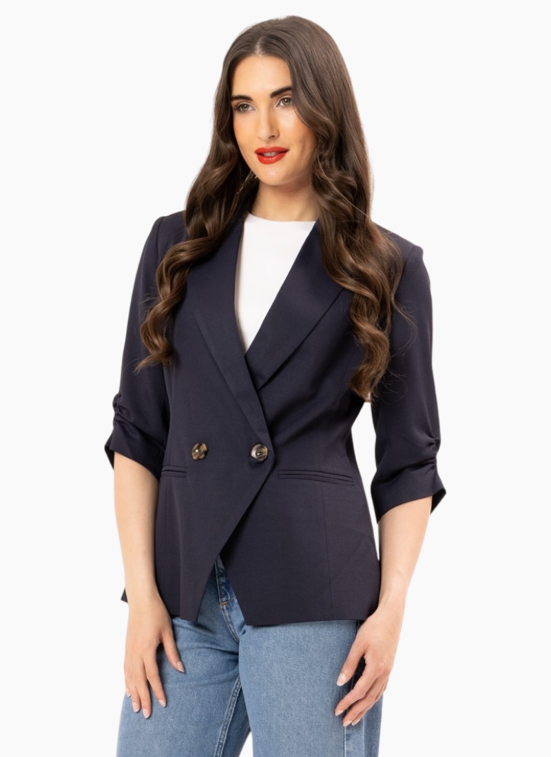 Three-quarter sleeves add a chic style point to this versatile jacket, a wardrobe essential.