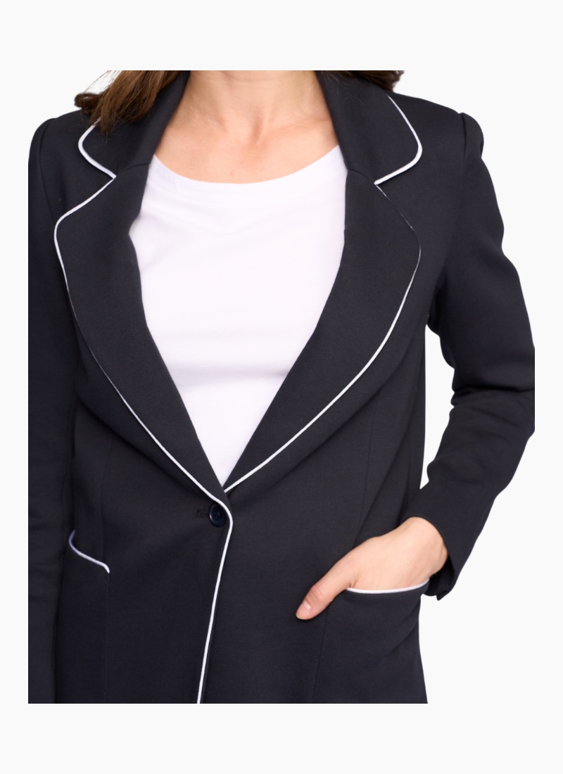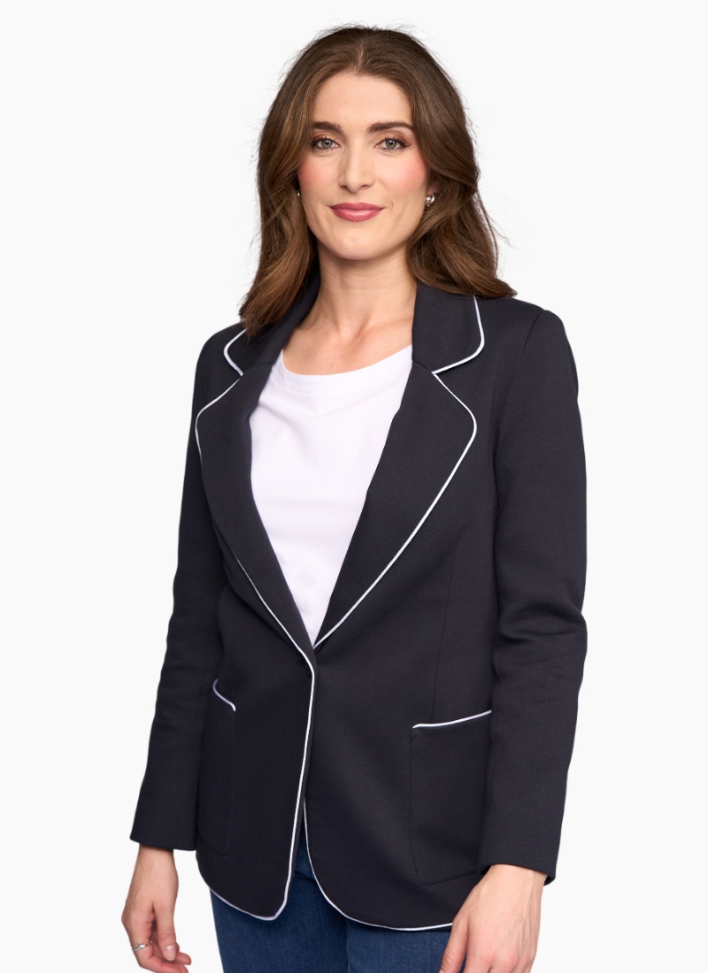 Introducing the Ora Blazer from Vassalli. This navy blazer with crisp white piping is a refined wardrobe staple that lifts both casual and work looks.