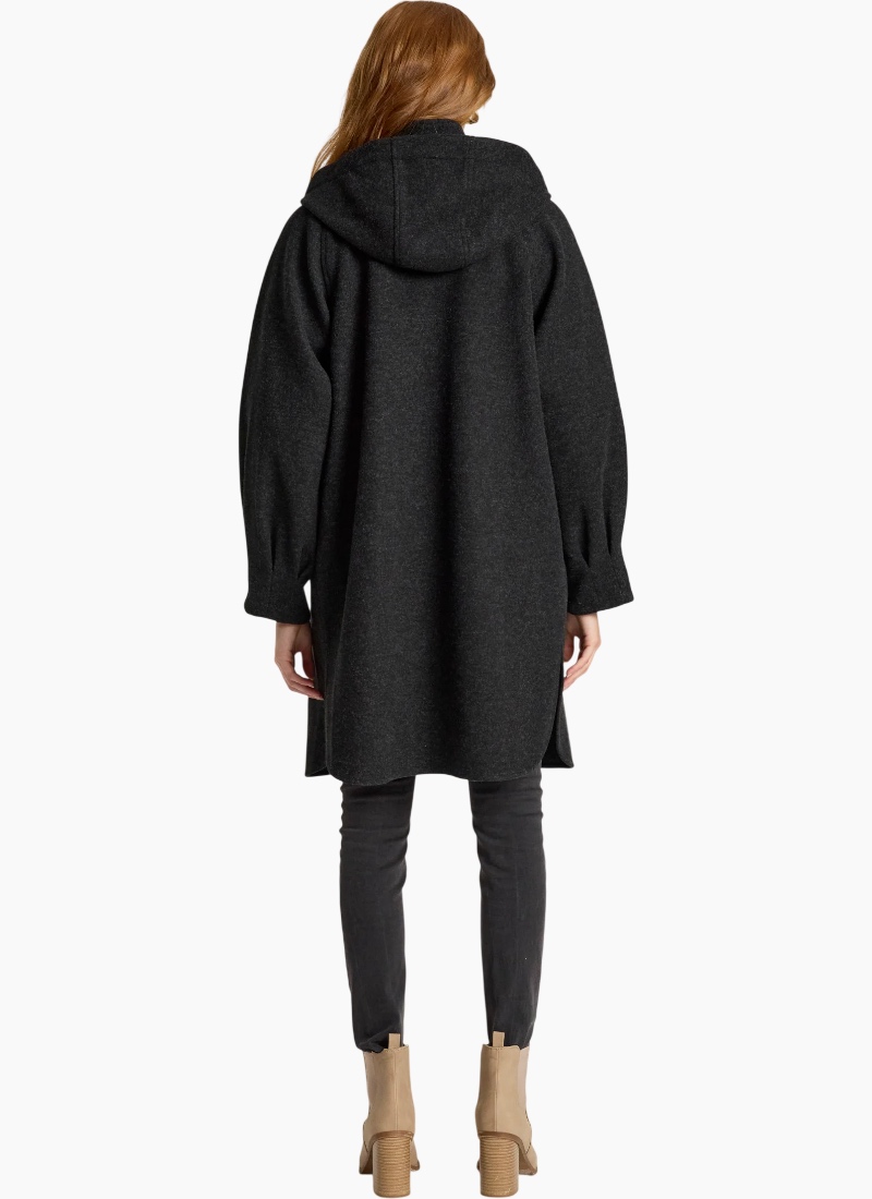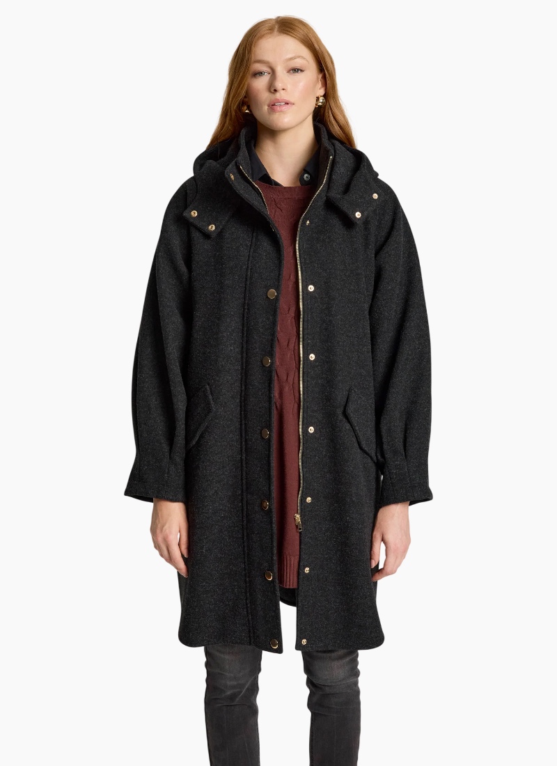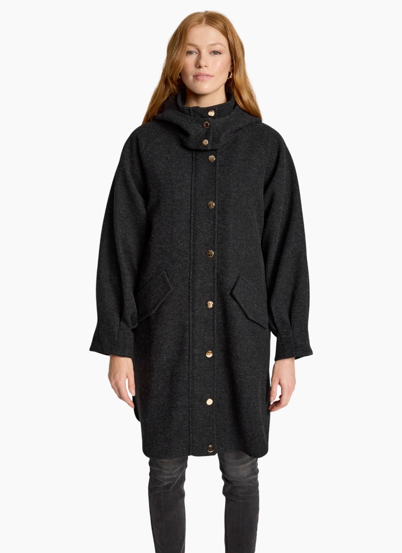 A cosy mid-length jacket designed for relaxed winter days. Featuring a sporty silhouette with a practical hood, zip-front closure and metal hardware detailing, this style blends warmth with everyday ease. Curved side seams and tapered sleeves create a flattering shape, while the wool-look fabrication offers a soft winter feel. Features Zip-front closure Hooded design Metal hardware detailing Curved side seams Tapered sleeves Pockets Wool-look fabrication Care Cold gentle wash recommended.