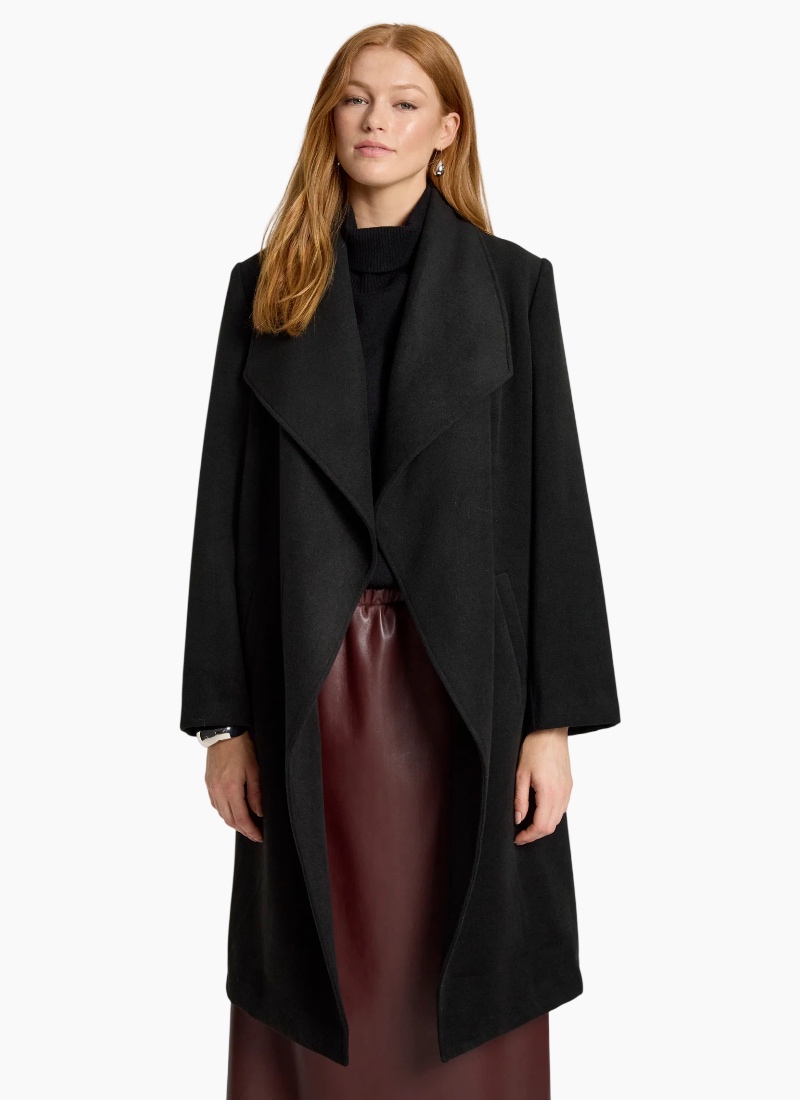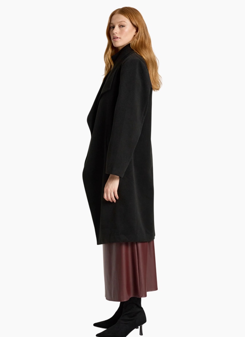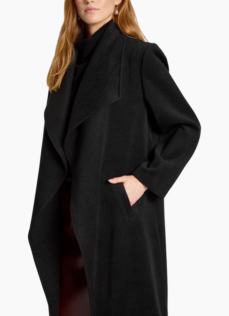 A relaxed longline coat designed to become a winter favourite. Featuring a waterfall collar and soft drape, this elegant style offers warmth, comfort and an effortlessly flattering silhouette. Easy to style for both work and evening wear, it layers beautifully over everyday outfits while adding a polished finish. Design Features Longline coat silhouette Waterfall collar Soft drape for an effortless fit Side pockets Wool-look fabrication