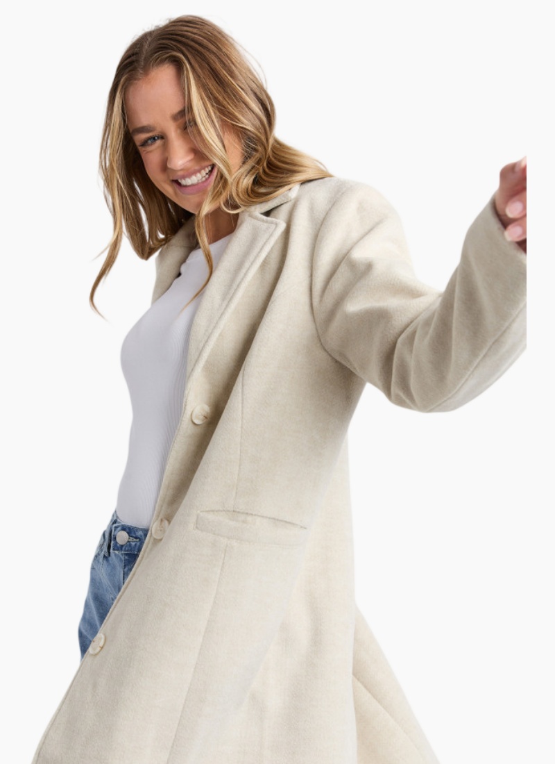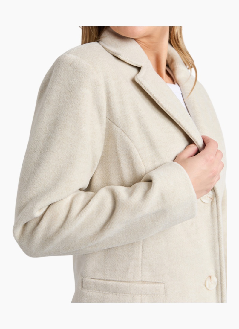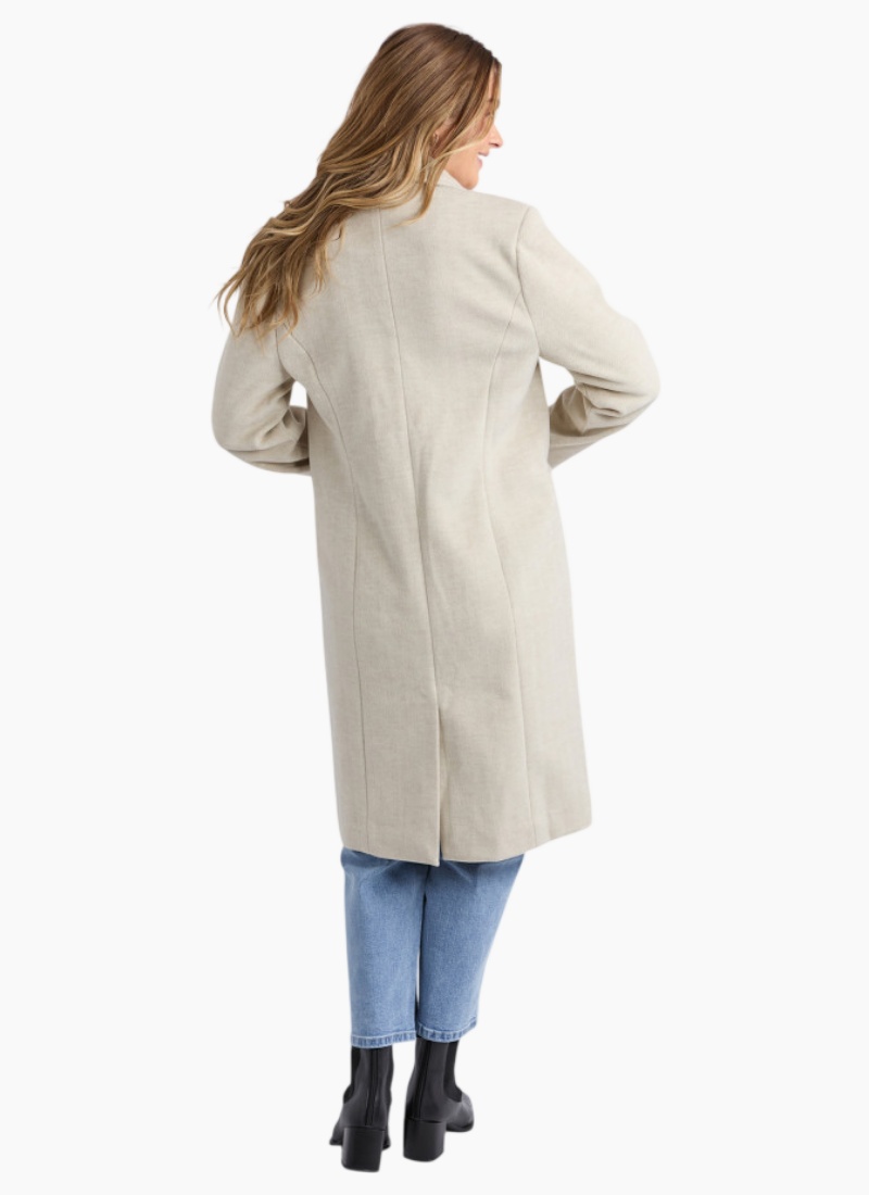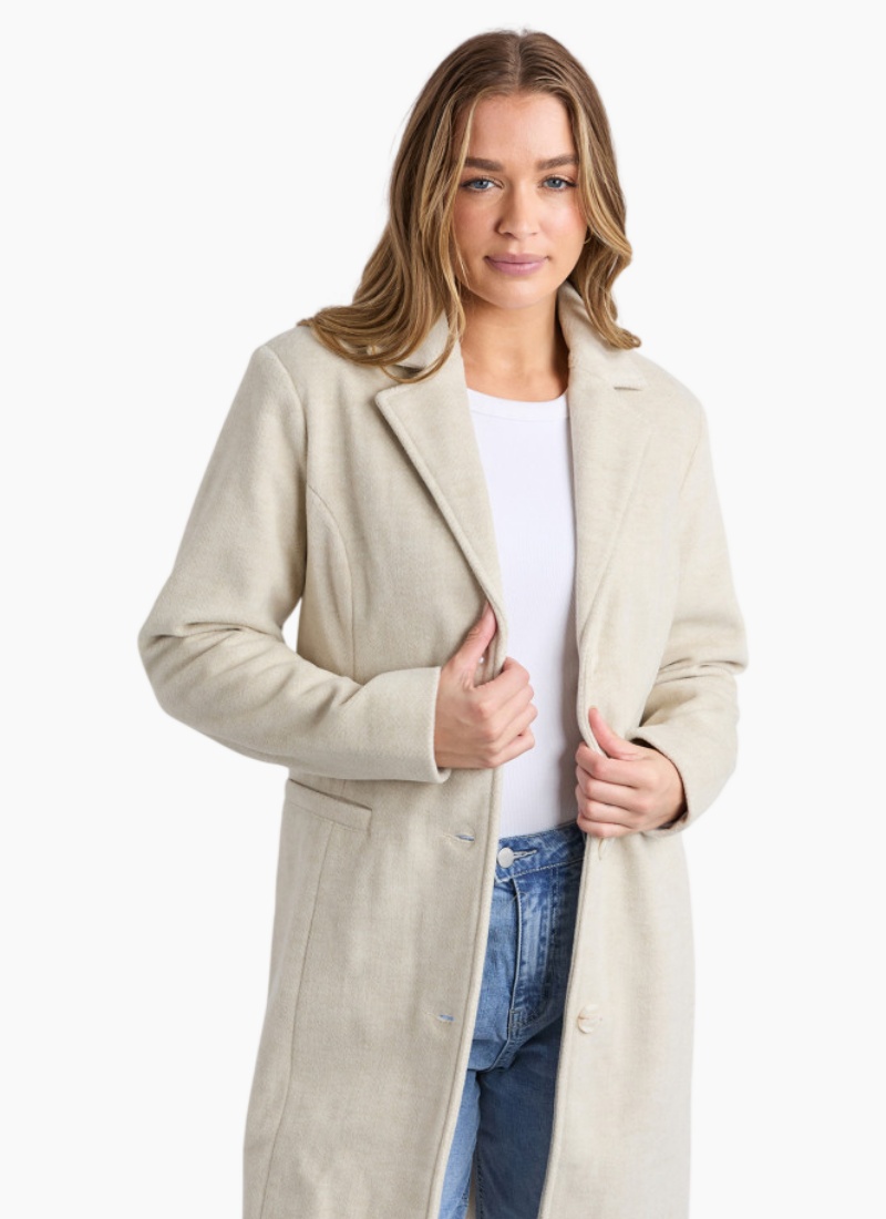 The Nelson Coat is a clean, tailored layer designed for everyday wear. Cut to a flattering mid length, it features a classic button-front closure and structured lapels for a polished look. Front pockets add practicality, making it an easy option to throw on over casual or dressed-up outfits alike. Front button opening Front pockets Mid length