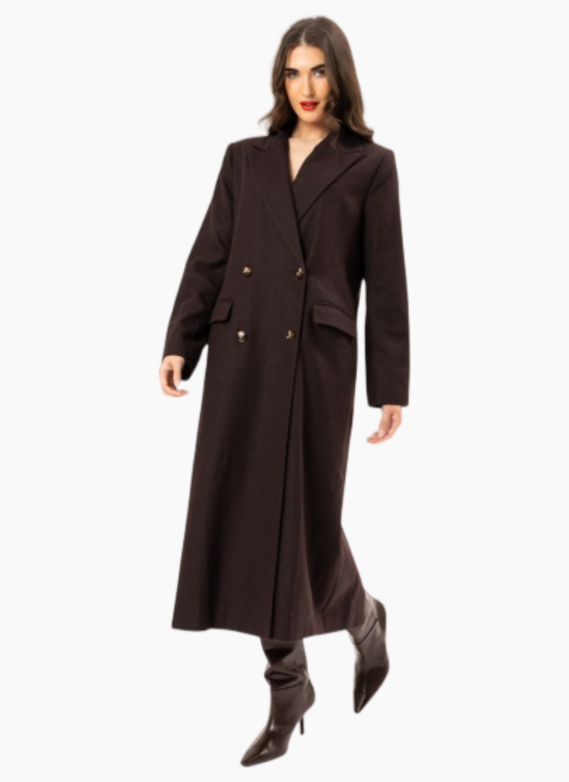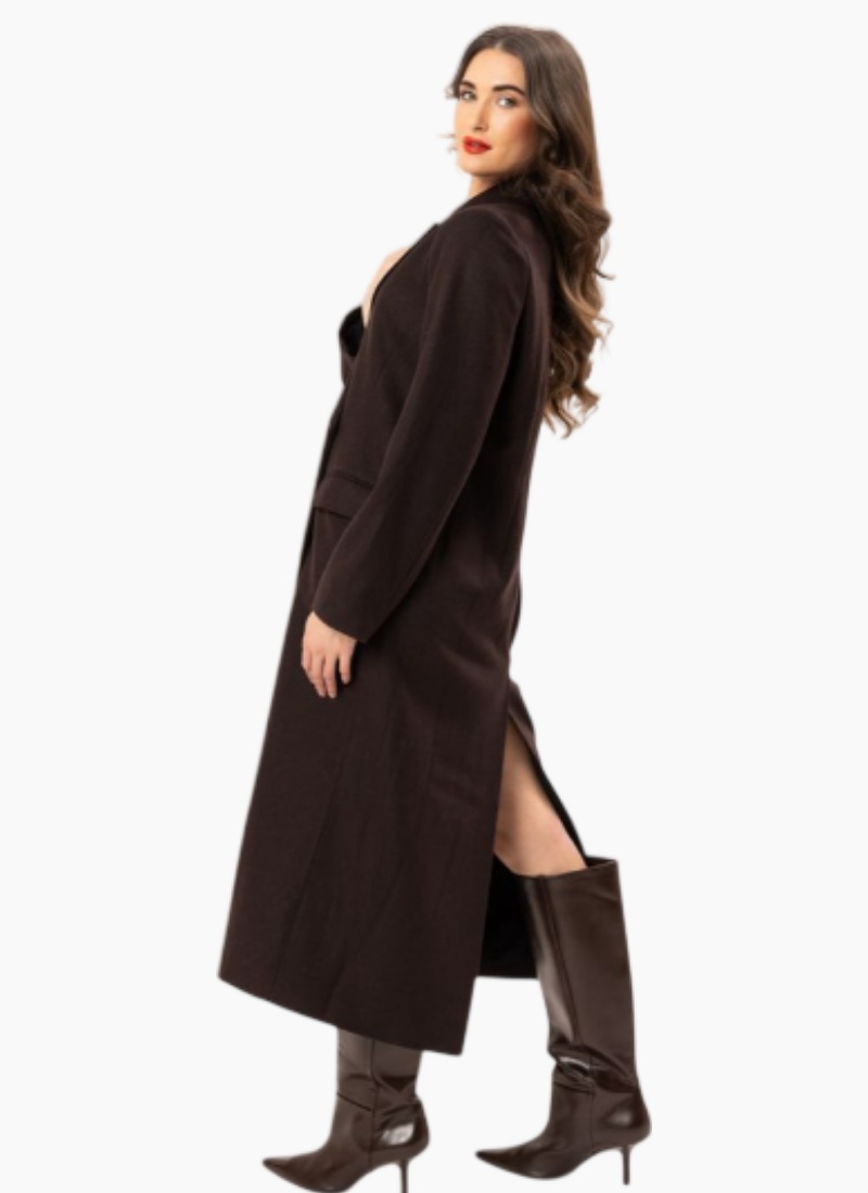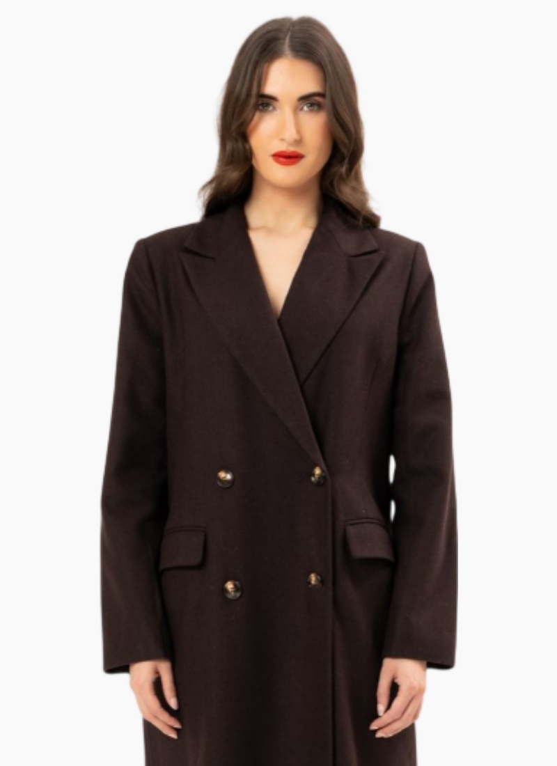 Introducing the Aspen Coat by Leila + Luca. A refined longline Coats silhouette in chocolate brown, crafted from a wool-blend for warmth and elegant structure.