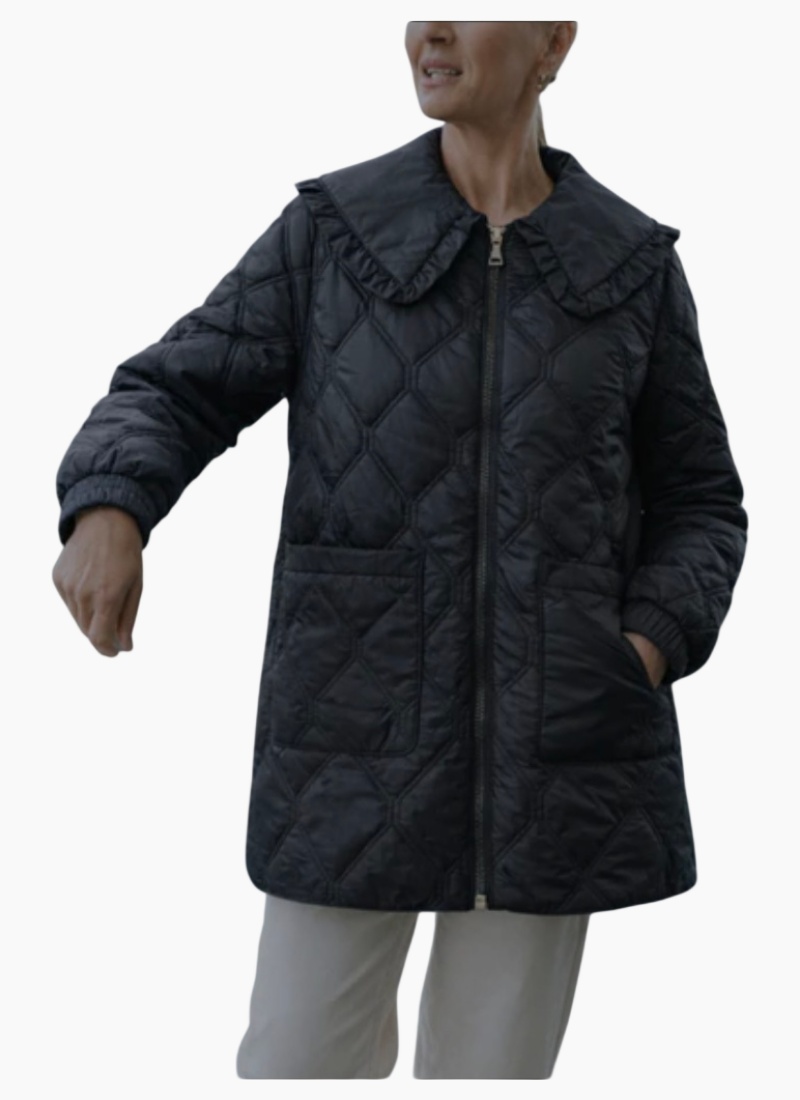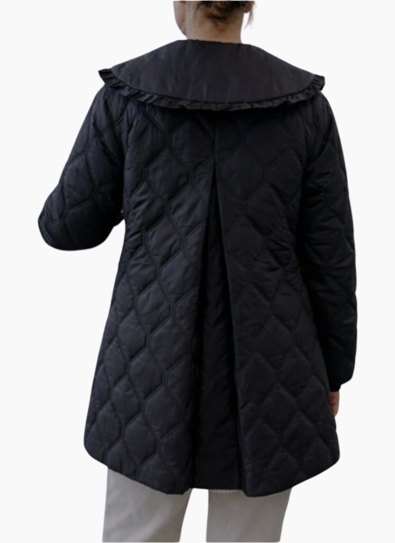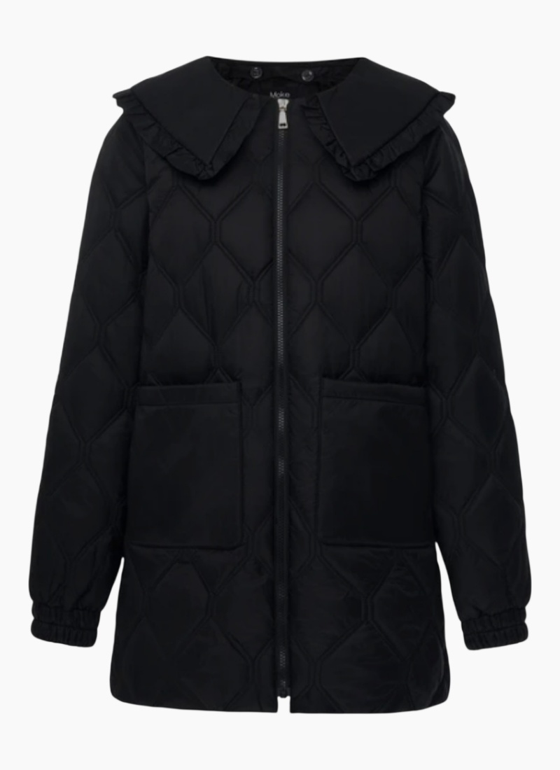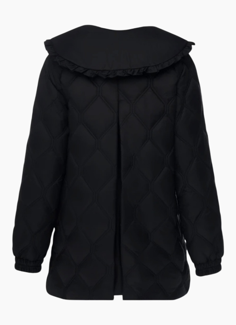 Introducing the Tess Quilt Coat Black from Moke. This quilted black coat pairs a softly ruffled collar with lightweight synthetic insulation for cosy, season‑spanning wear.
