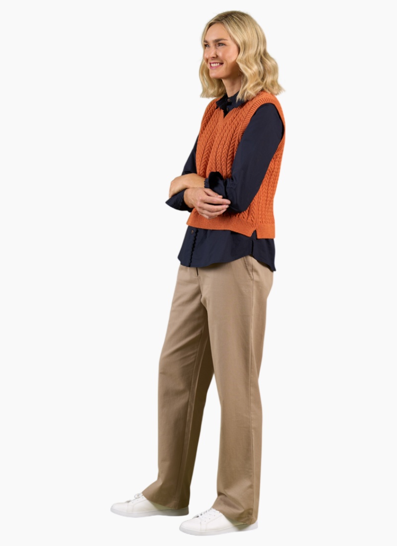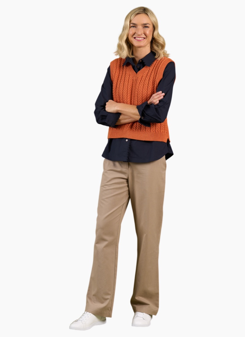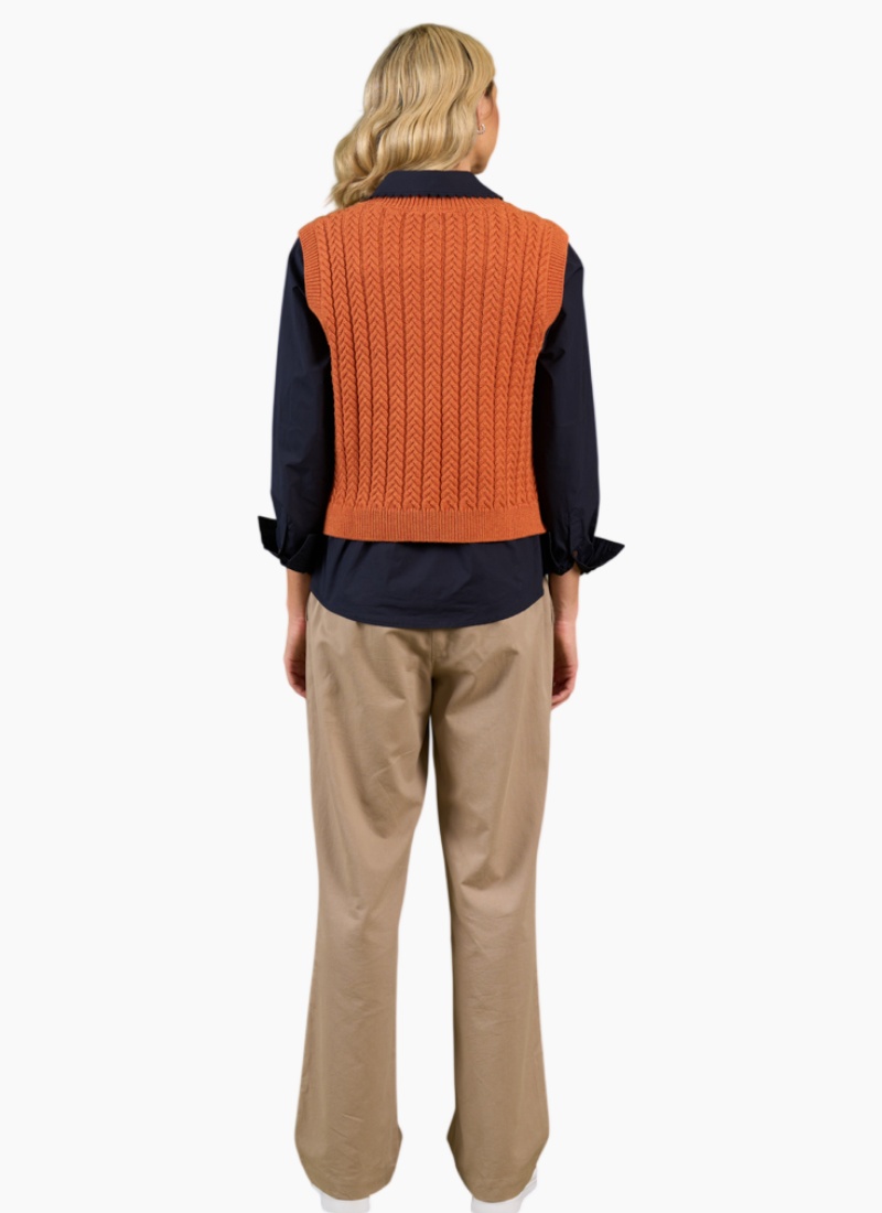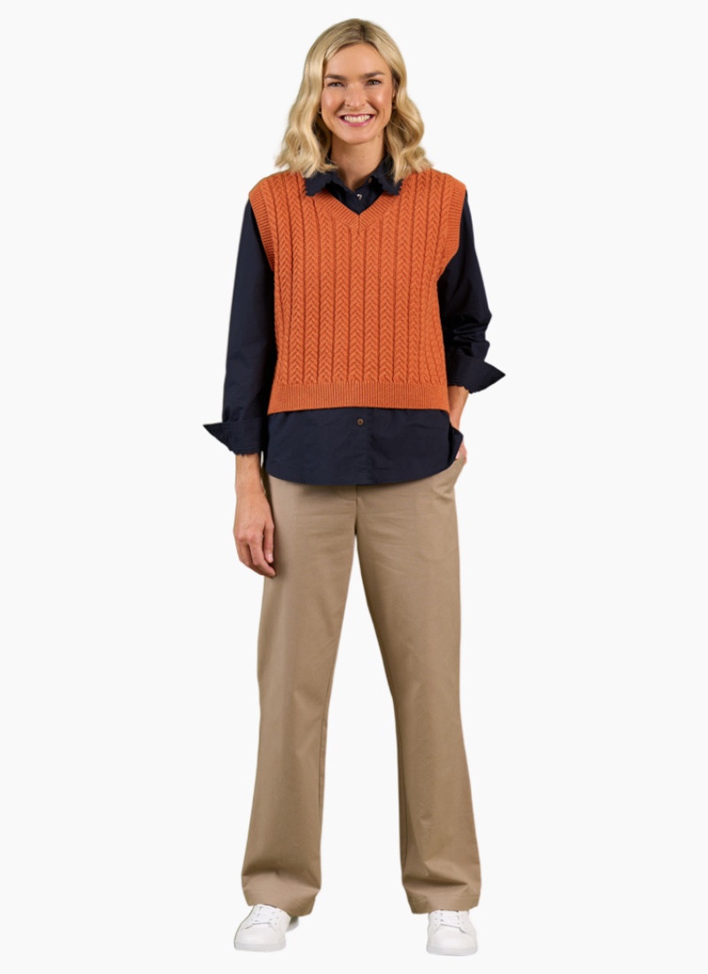 Introducing the Arthurs Pass Vest Koi from Charlie Jane. This cosy cable-knit vest in koi orange brings instant warmth and modern polish to everyday layering.