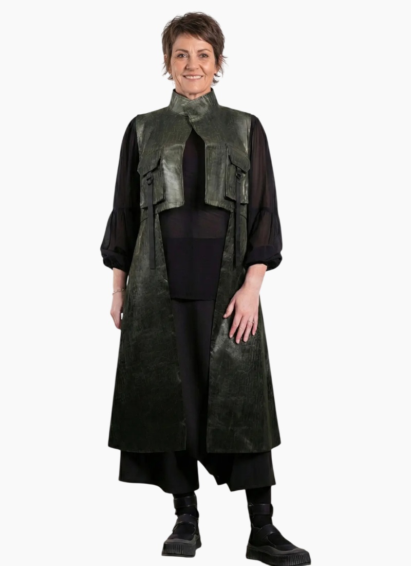 Introducing the Construction Coat from Deanne Hobbs — a sculptural longline vest that brings architectural polish to layered wardrobes. This striking forest green piece reads like an outer coat with the ease of a sleeveless vest for modern versatility.