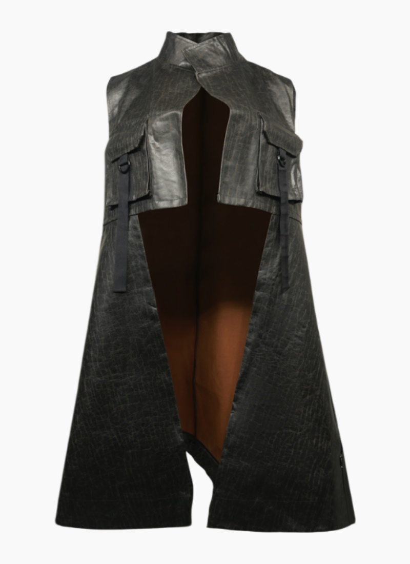 - Longline, sleeveless silhouette with a high stand collar for an architectural profile