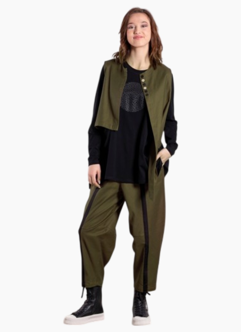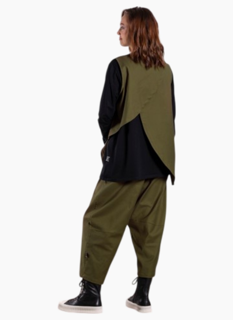 Introducing the Frankie Vest — Bay Leaf from Deanne Hobbs. This longline vest in a rich bay leaf olive green brings contemporary layering and structured tailoring to your wardrobe.