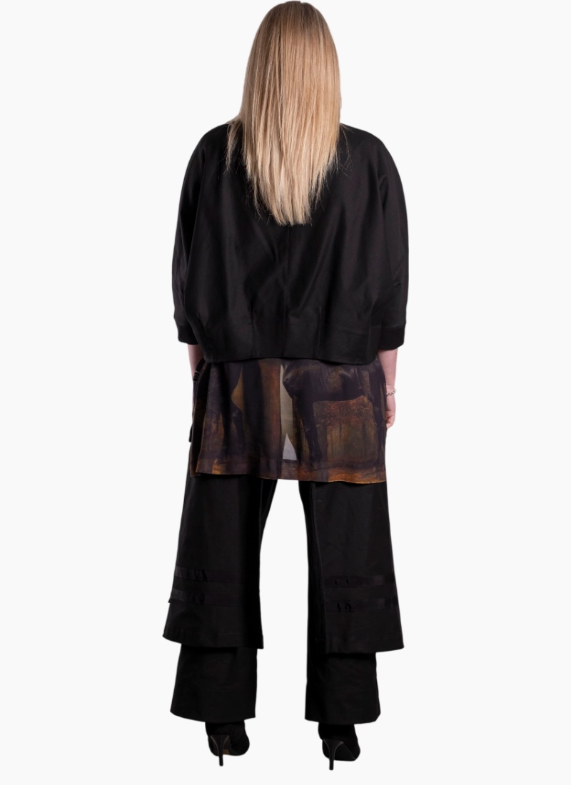 - Short, boxy silhouette with clean hems that sits beautifully over tunics and dresses
