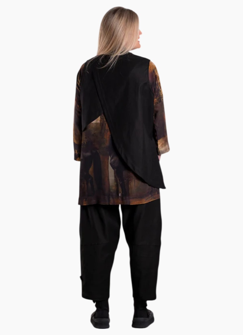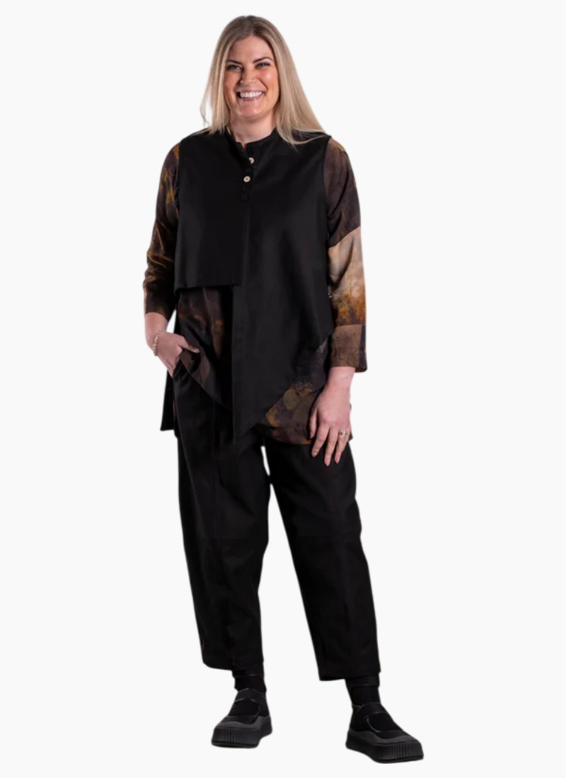 This is a structured yet easy-wear women’s vest designed to layer effortlessly over dresses, tops, and shirts. Featuring an asymmetrical front hem and button detail through the upper bodice, the Frankie Vest adds shape and interest without bulk, creating a strong but wearable silhouette. Designed in New Zealand for real women, this vest offers versatile layering for cooler months while maintaining comfort and movement across all sizes. Key Features Relaxed structured fit through the body Sleeveless design for easy layering Asymmetrical front hemline Button detail through the upper front Clean neckline finish Straight back hem Hip-length with extended front drop Easy open-front style Fabric: Stretch Cotton Colour: Black
