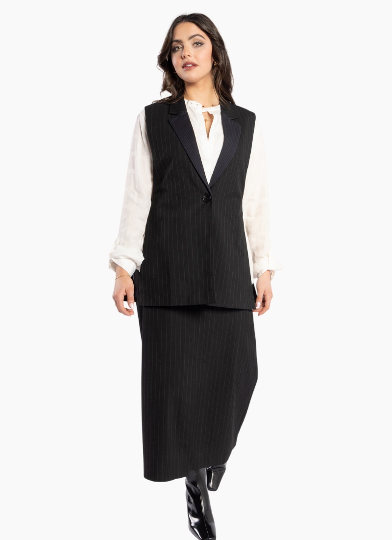 The Au Lait Waistcoat is a long-line, stylish women’s waistcoat designed in New Zealand by Drama the Label for effortless chic. Featuring a one-button front, side and back splits, and a navy-striped collar and tabs, this noir stripe waistcoat is fully lined and perfect for layering. Pair it with the matching Lake Pants and Espresso Blazer for a coordinated, sophisticated look — a modern, versatile piece that elevates any outfit.