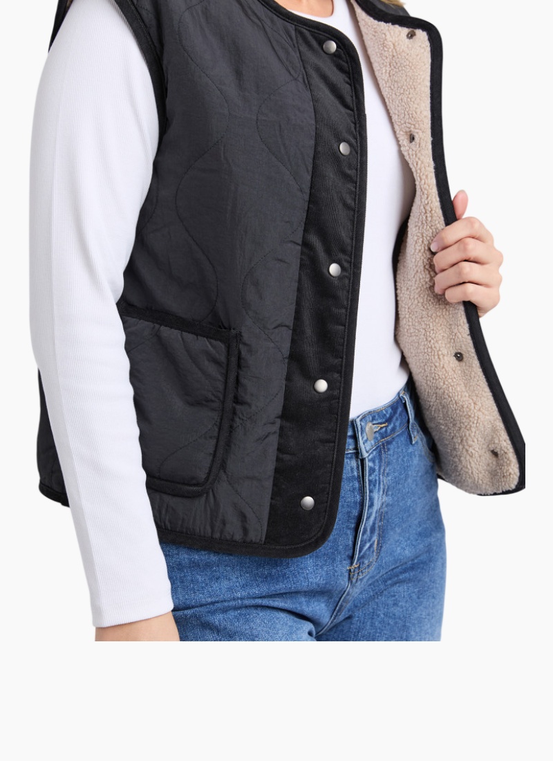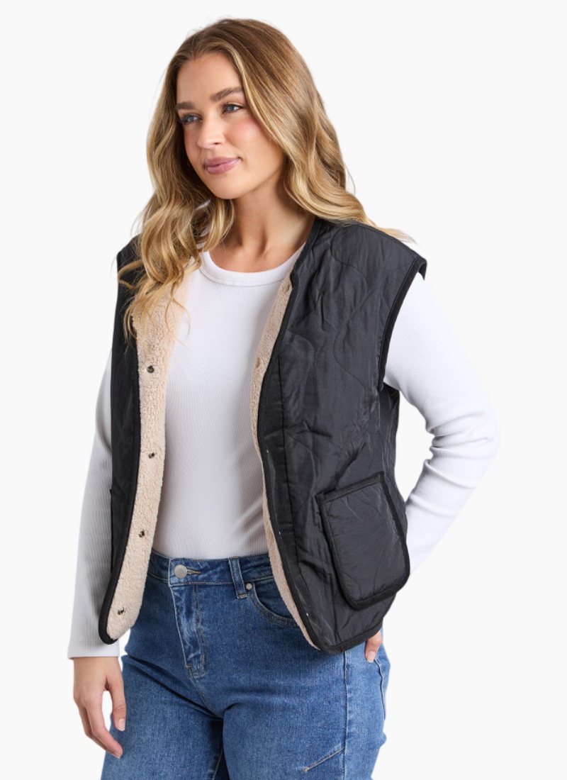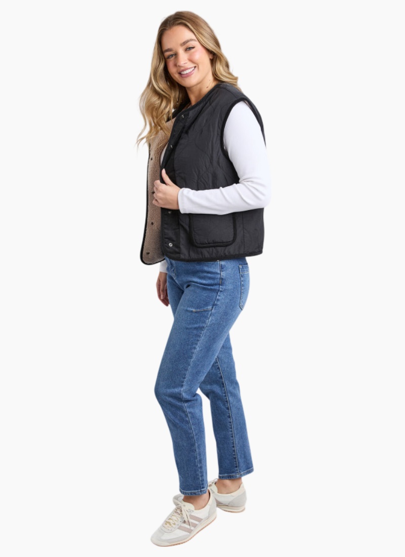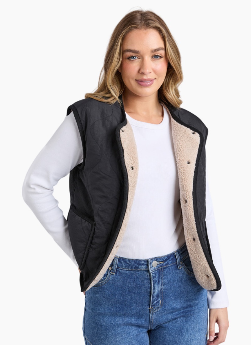 The Alberta Vest is the perfect layering piece for those in-between days. Featuring a classic quilted body with cosy sherpa lining, it adds warmth without restricting movement. Finished with a simple front snap opening, it’s easy to throw on over long sleeves, knits, or hoodies for an extra layer of comfort.